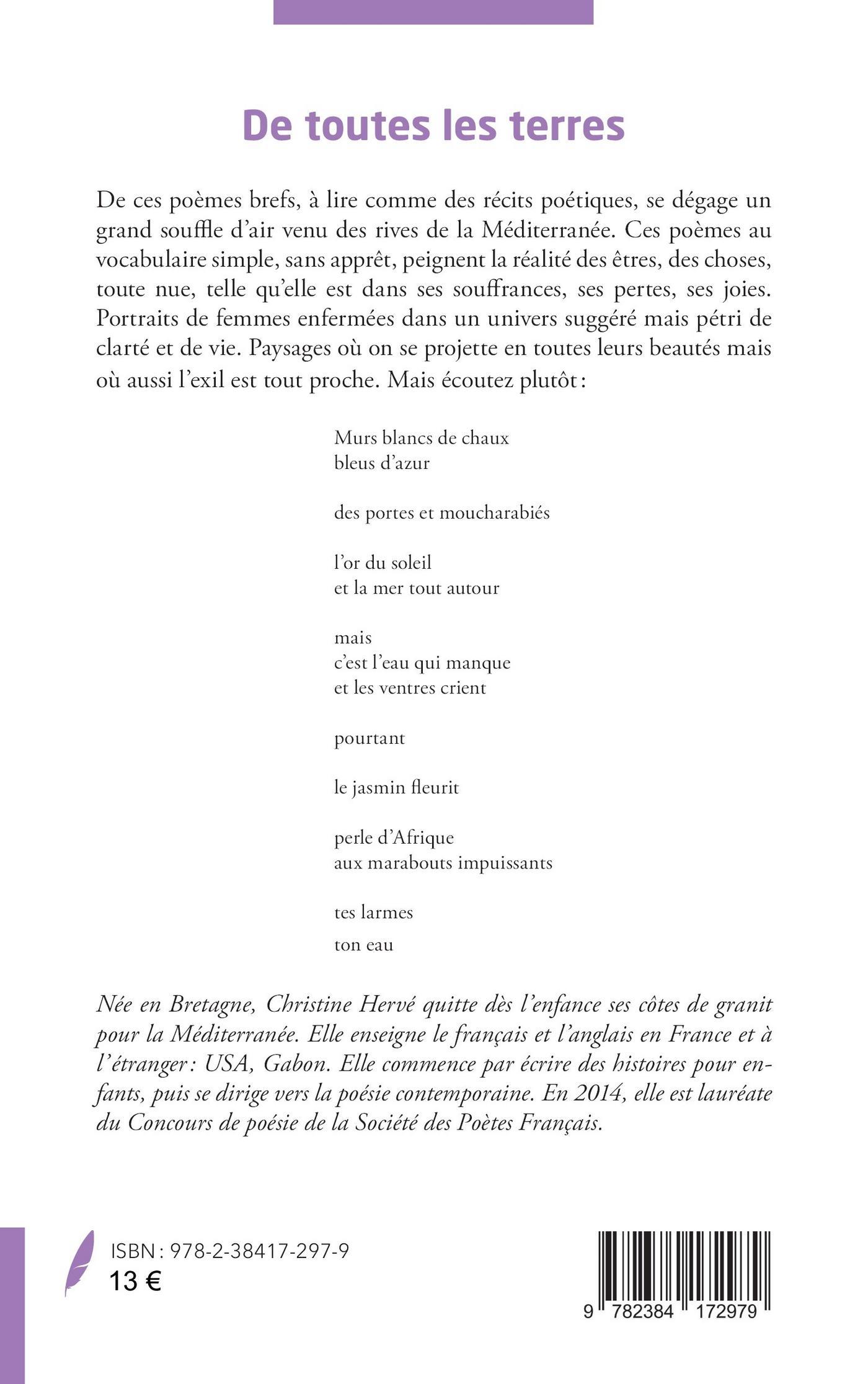 De ces poèmes brefs, à lire comme des récits poétiques, se dégage un grand souffle d’air venu des rives de la Méditerranée. Ces poèmes au vocabulaire simple, sans apprêt, peignent la réalité des êtres, des choses, toute nue, telle qu’elle est dans ses souffrances, ses pertes, ses joies. Portraits de femmes enfermées dans un univers suggéré mais pétri de clarté et de vie. Paysages où on se projette en toutes leurs beautés mais où aussi l’exil est tout proche. Mais écoutez plutôt: Murs blancs de chaux / bleus d’azur / des portes et moucharabiés /l’or du soleil / et la mer tout autour /mais / c’est l’eau qui manque /et les ventres crient pourtant le jasmin fleurit / perle d’Afrique /aux marabouts impuissants / tes larmes ton eau