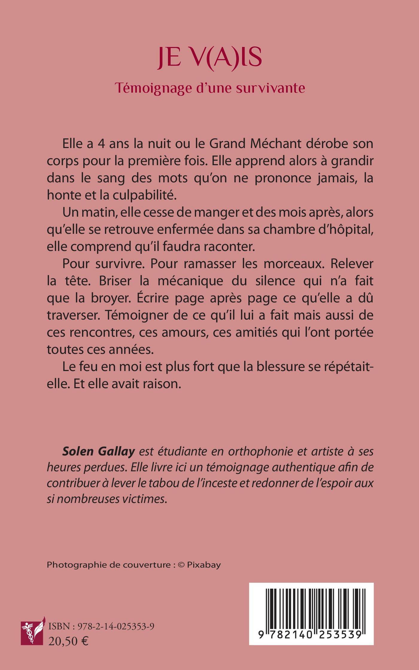 Elle a 4 ans la nuit ou le Grand Méchant dérobe son corps pour la première fois. Elle apprend alors à grandir dans le sang des mots qu'on ne prononce jamais, la honte et la culpabilité. Un matin, elle cesse de manger et des mois après, alors qu'elle se retrouve enfermée dans sa chambre d'hôpital, elle comprend qu'il faudra raconter. Pour survivre. Pour ramasser les morceaux. Relever la tête. Briser la mécanique du silence qui n'a fait que la broyer. Écrire page après page ce qu'elle a dû traverser. Témoigner de ce qu'il lui a fait mais aussi de ces rencontres, ces amours, ces amitiés qui l'ont portée toutes ces années. Le feu en moi est plus fort que la blessure se répétait- elle. Et elle avait raison.