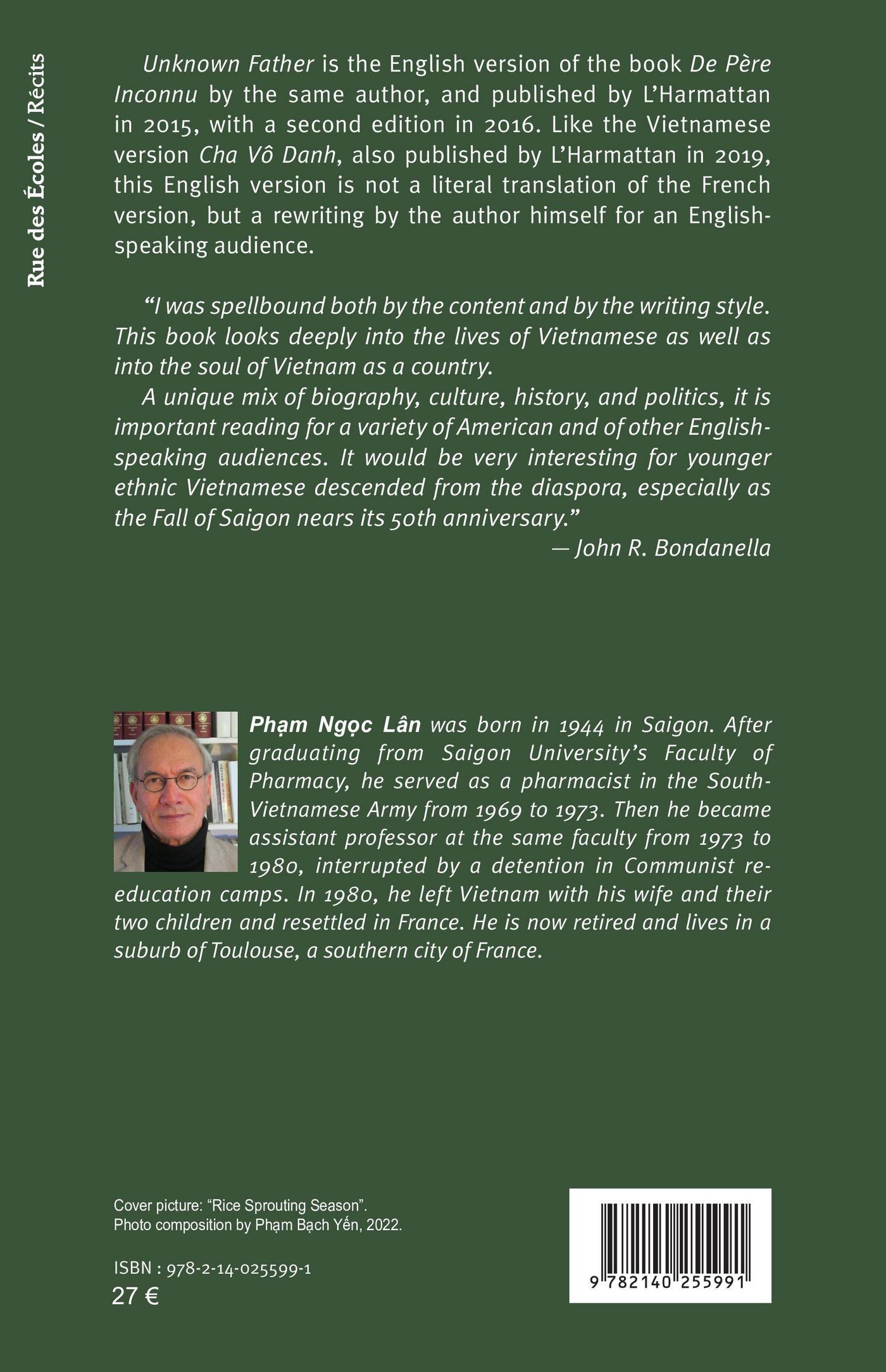 Unknown Father is the English version of the book De Père Inconnu by the same author, and published by L’Harmattan in 2015, with a second edition in 2016. Like the Vietnamese version Cha Vô Danh, also published by L’Harmattan in 2019, this English version is not a literal translation of the French version, but a rewriting by the author himself for an Englishspeaking audience.''I was spellbound both by the content and by the writing style. This book looks deeply into the lives of Vietnamese as well as into the soul of Vietnam as a country. A unique mix of biography, culture, history, and politics, it is important reading for a variety of American and of other Englishspeaking audiences. It would be very interesting for younger ethnic Vietnamese descended from the diaspora, especially as the Fall of Saigon nears its 50th anniversary.'' John R. Bondanella