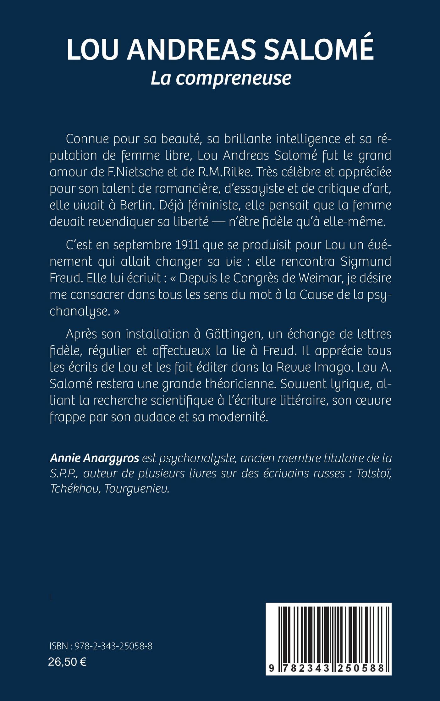 Connue pour sa beauté, sa brillante intelligence et sa réputation de femme libre, Lou Andreas Salomé fut le grand amour de Nietzsche et de Rilke. Très célèbre et appréciée pour son talent de romancière, d’essayiste et de critique d’art, elle vivait à Berlin. Déjà féministe, elle pensait que la femme devait revendiquer sa liberté - n’être fidèle qu’à elle-même. C’est en septembre 1911 que se produisit pour Lou un événement qui allait changer sa vie : elle rencontra Sigmund Freud. Elle lui écrivit : « Depuis le Congrès de Weimar, je désire me consacrer dans tous les sens du mot à la Cause de la psychanalyse. » Après son installation à Göttingen, un échange de lettres fidèle, régulier et affectueux la lie à Freud. Il apprécie tous les écrits de Lou et les fait éditer dans la Revue Imago. Lou A. Salomé restera une grande théoricienne. Souvent lyrique, alliant la recherche scientifique à l’écriture littéraire, son oeuvre frappe par son audace et sa modernité.
