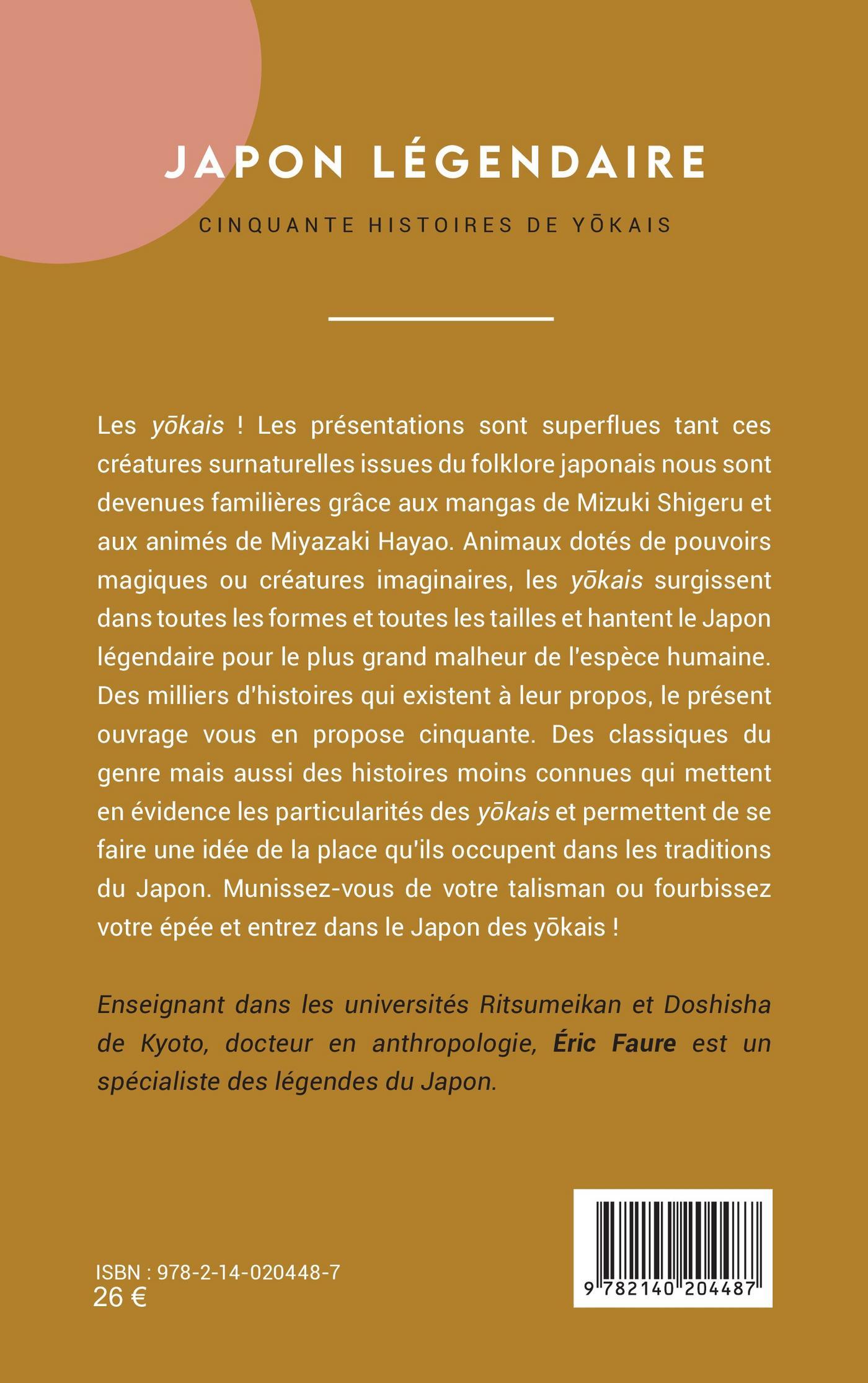 Les yokais ! Les présentations sont superflues tant ces créatures surnaturelles issues du folklore japonais nous sont devenues familières grâce aux mangas de Mizuki Shigeru et aux animés de Miyazaki Hayao. Animaux dotés de pouvoirs magiques ou créatures imaginaires, les yokais surgissent dans toutes les formes et toutes les tailles et hantent le Japon légendaire pour le plus grand malheur de l’espèce humaine. Des milliers d’histoires qui existent à leur propos, le présent ouvrage vous en propose cinquante. Des classiques du genre mais aussi des histoires moins connues qui mettent en évidence les particularités des yokais et permettent de se faire une idée de la place qu’ils occupent dans les traditions du Japon. Munissez-vous de votre talisman ou fourbissez votre épée et entrez dans le Japon des yokais !
