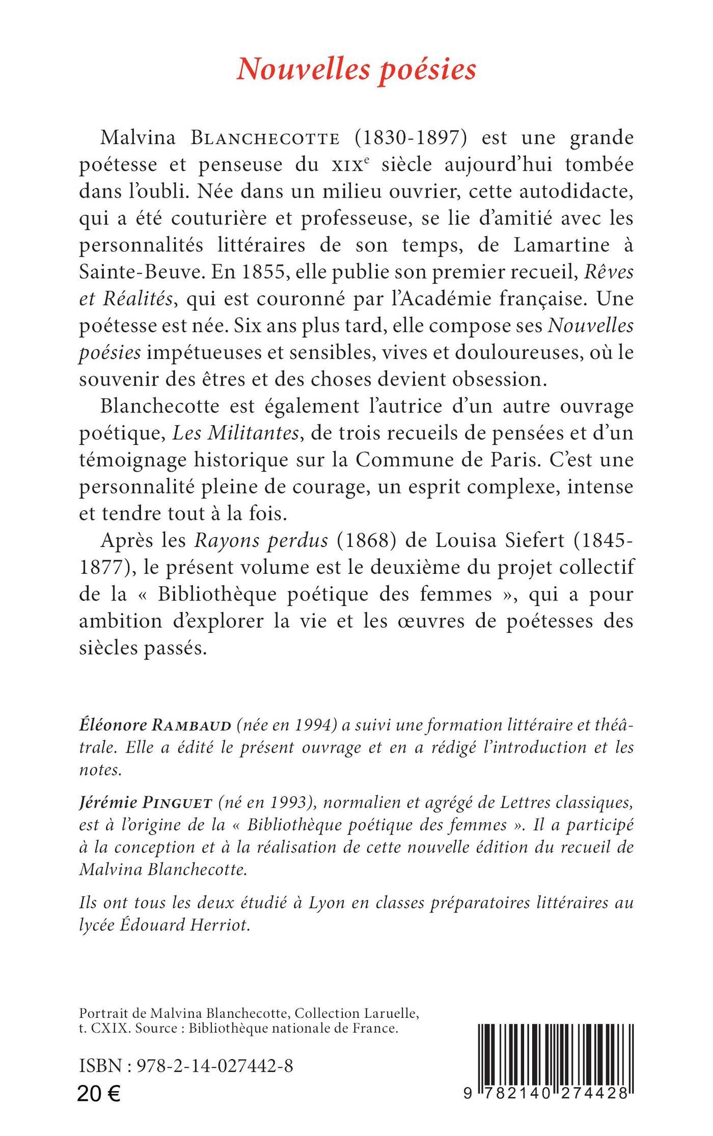 Malvina Blanchecotte (1830-1897) est une grande poétesse et penseuse du XIXe siècle aujourd’hui tombée dans l’oubli. Née dans un milieu ouvrier, cette autodidacte, qui a été couturière et professeuse, se lie d’amitié avec les personnalités littéraires de son temps, de Lamartine à Sainte-Beuve. En 1855, elle publie son premier recueil, Rêves et Réalités, qui est couronné par l’Académie française. Six ans plus tard, elle compose ses Nouvelles poésies impétueuses et sensibles, vives et douloureuses, où le souvenir des êtres et des choses devient obsession. Blanchecotte est également l’autrice d’un autre ouvrage poétique, Les Militantes, de trois recueils de pensées et d’un témoignage historique sur la Commune de Paris. Après les Rayons perdus de Louisa Siefert, le présent volume est le deuxième du projet collectif de la « Bibliothèque poétique des femmes », qui a pour ambition d’explorer la vie et les œuvres de poétesses des siècles passés.