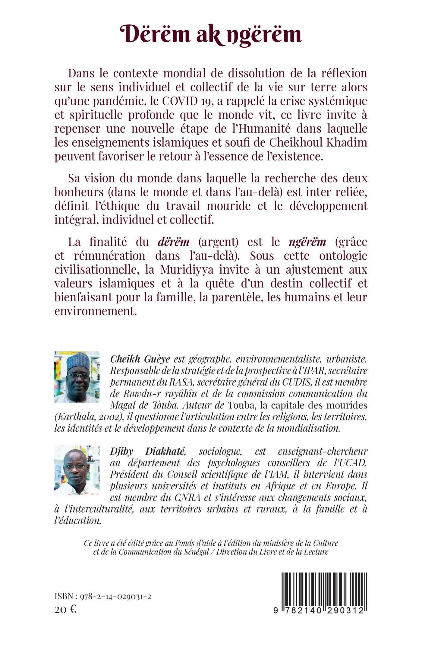 Dans le contexte mondial de dissolution de la réflexion sur le sens individuel et collectif de la vie sur terre alors qu'une pandémie, le COVID 19, a rappelé la crise systémique et spirituelle profonde que le monde vit, ce livre invite à repenser une nouvelle étape de l'Humanité dans laquelle les enseignements islamiques et soufi de Cheikhoul Khadim peuvent favoriser le retour à l'essence de l'existence. Sa vision du monde dans laquelle la recherche des deux bonheurs (dans le monde et dans l'au-delà) est inter reliée, définit l'éthique du travail mouride et le développement intégral, individuel et collectif. La finalité du dërëm (argent) est le ngërëm (grâce et rémunération dans l'au-delà). Sous cette ontologie civilisationnelle, la Muridiyya invite à un ajustement aux valeurs islamiques.