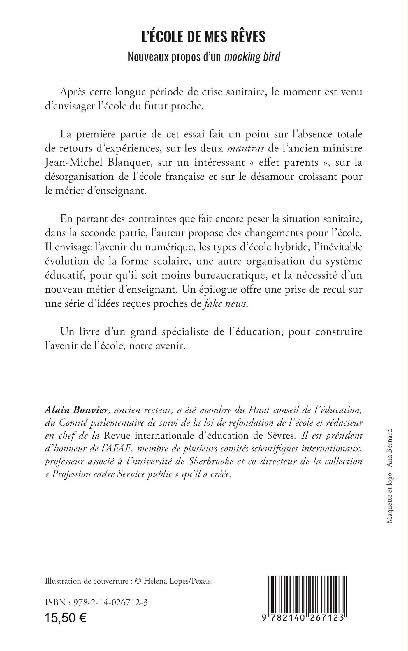 Après cette longue période de crise sanitaire, le moment est venu d’envisager l’école du futur proche. La première partie de cet essai fait un point sur l’absence totale de retours d’expériences, sur les deux mantras de l’ancien ministre Jean-Michel Blanquer, sur un intéressant « effet parents », sur la désorganisation de l’école française et sur le désamour croissant pour le métier d’enseignant. En partant des contraintes que fait encore peser la situation sanitaire, dans la seconde partie, l’auteur propose des changements pour l’école. Il envisage l’avenir du numérique, les types d’école hybride, l’inévitable évolution de la forme scolaire, une autre organisation du système éducatif, pour qu’il soit moins bureaucratique, et la nécessité d’un nouveau métier d’enseignant. Un épilogue offre une prise de recul sur une série d’idées reçues proches de fake news. Un livre d’un grand spécialiste de l’éducation, pour construire l’avenir de l’école, notre avenir.