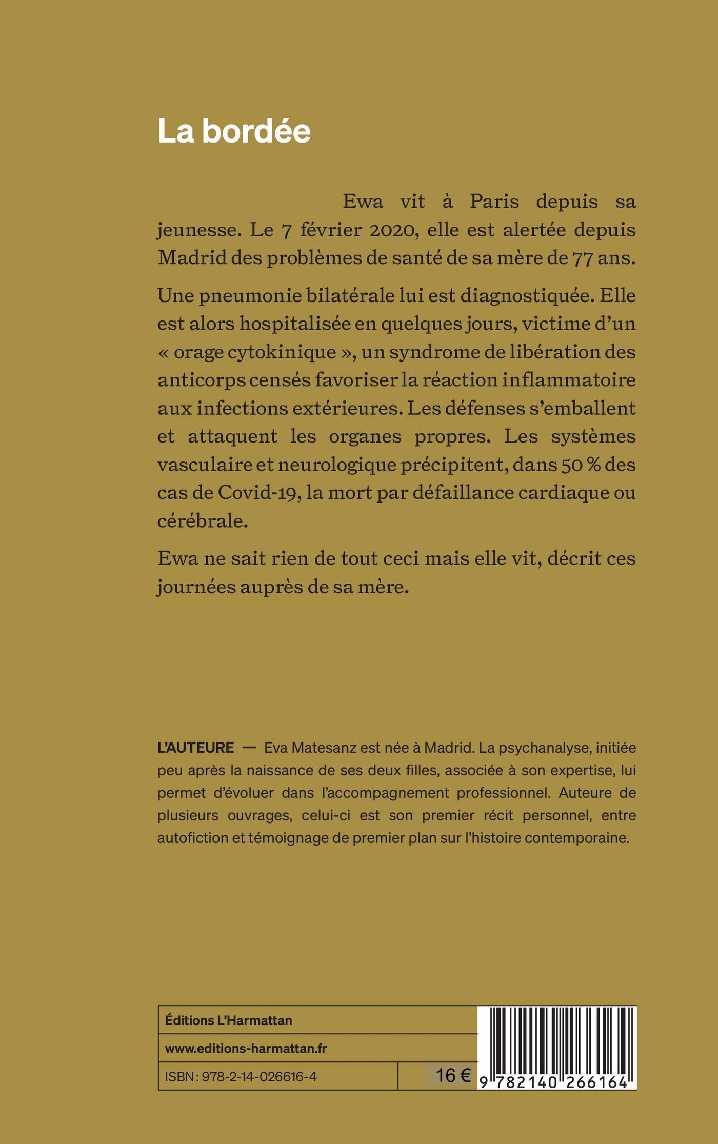 Ewa vit à Paris depuis sa jeunesse. Le 7 février 2020, elle est alertée depuis Madrid des problèmes de santé de sa mère de 77 ans. Une pneumonie bilatérale lui est diagnostiquée. Elle est alors hospitalisée en quelques jours, victime d’un« orage cytokinique », un syndrome de libération des anticorps censés favoriser la réaction inflammatoire aux infections extérieures. Les défenses s’emballent et attaquent les organes propres. Les systèmes vasculaire et neurologique précipitent, dans 50 % des cas de Covid-19, la mort par défaillance cardiaque ou cérébrale. Ewa ne sait rien de tout ceci mais elle vit, décrit ces journées auprès de sa mère. Eva Matesanz est née à Madrid. La psychanalyse, initiée peu après la naissance de ses deux filles, associée à son expertise, lui permet d’évoluer dans l’accompagnement professionnel.