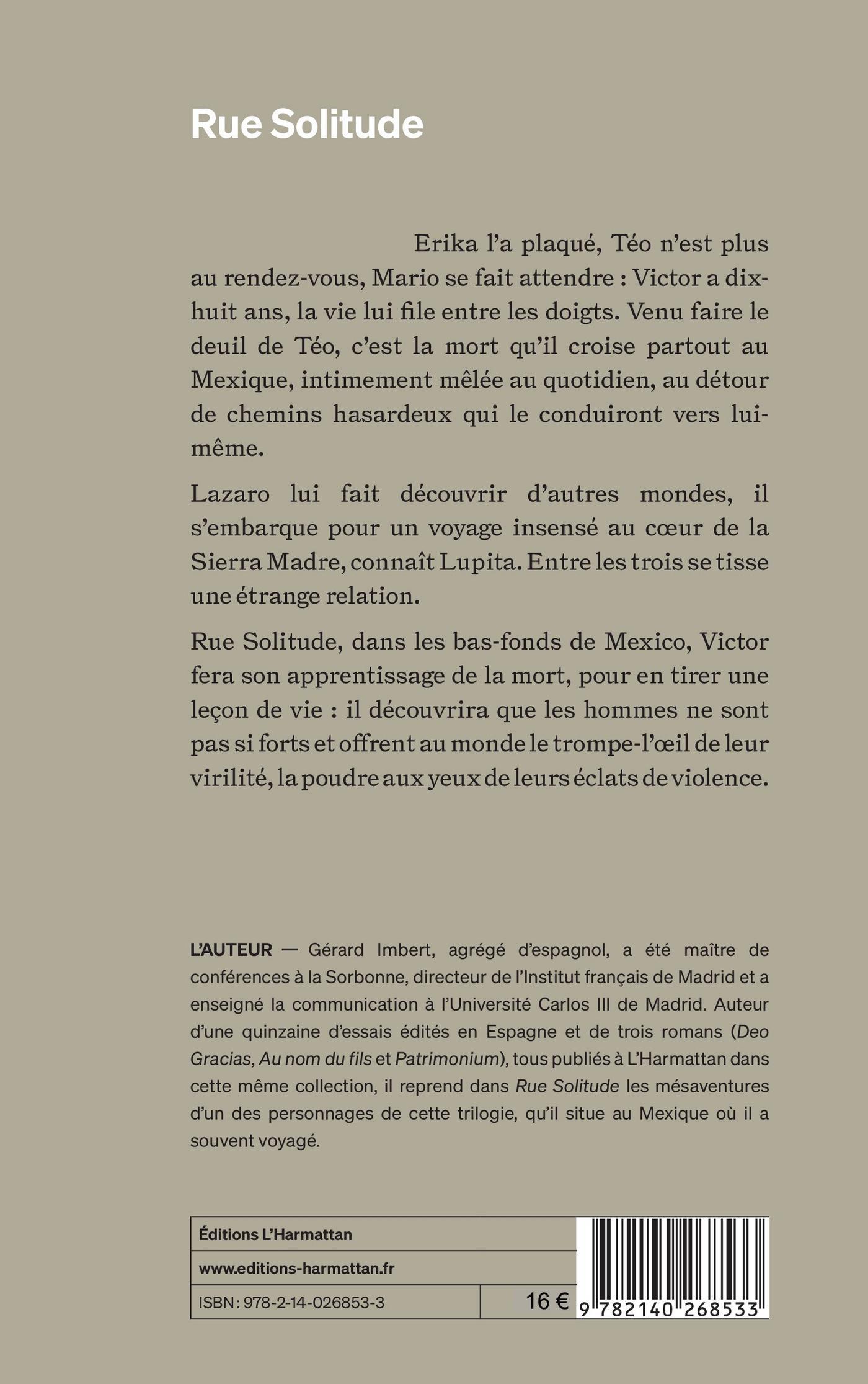 Erika l’a plaqué, Téo n’est plusau rendez-vous, Mario se fait attendre : Victor a dix huit ans, la vie lui file entre les doigts. Venu faire le deuil de Téo, c’est la mort qu’il croise partout au Mexique, intimement mêlée au quotidien, au détourde chemins hasardeux qui le conduiront vers lui même. Lazaro lui fait découvrir d’autres mondes, ils’embarque pour un voyage insensé au coeur de la Sierra Madre, connaît Lupita. Entre les trois se tisse une étrange relation. Rue Solitude, dans les bas-fonds de Mexico, Victor fera son apprentissage de la mort, pour en tirer une leçon de vie : il découvrira que les hommes ne sont pas si forts et offrent au monde le trompe-l’oeil de leur virilité, la poudre aux yeux de leurs éclats de violence.