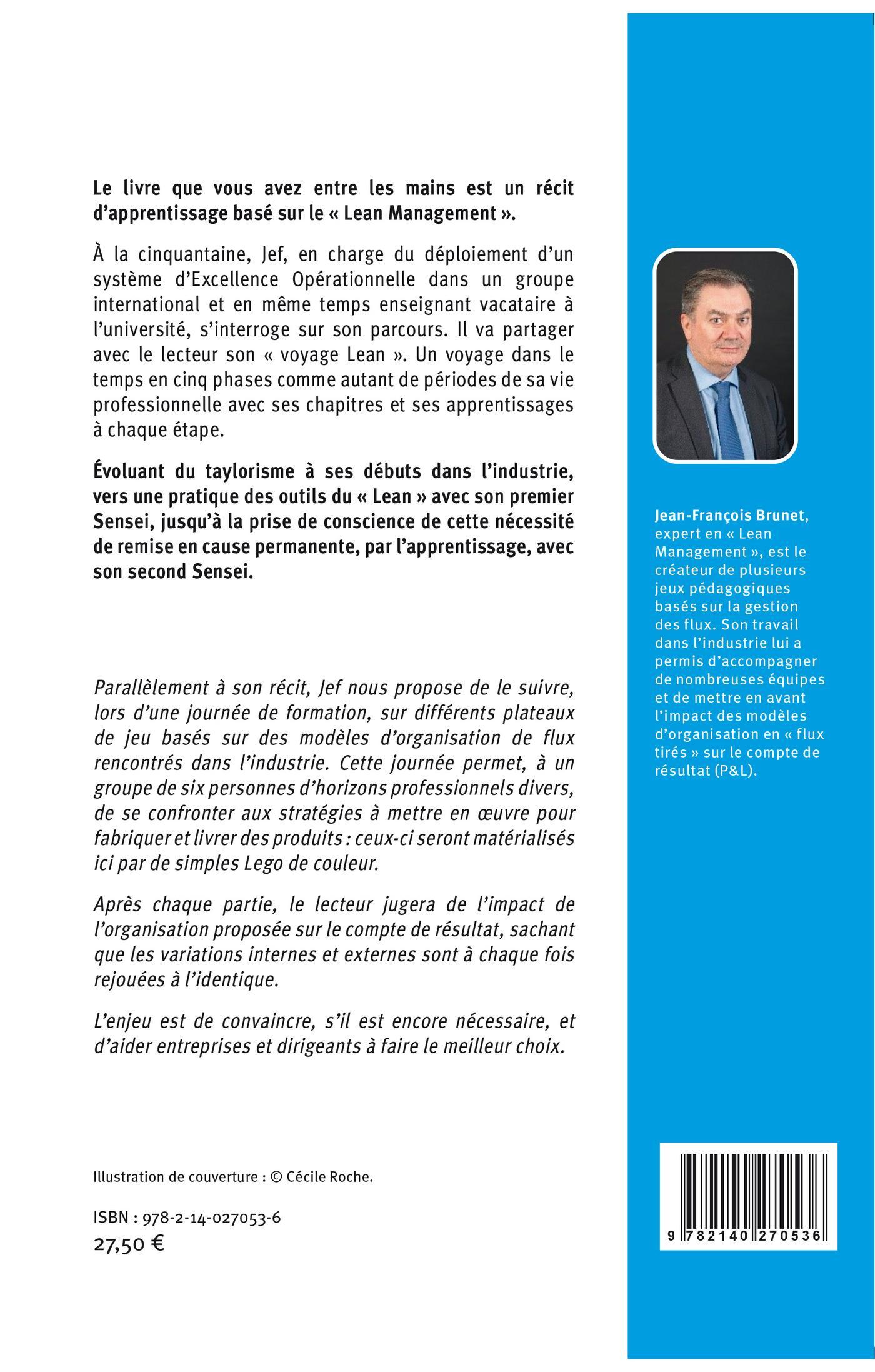 Cet ouvrage est un récit d’apprentissage basé sur le « Lean Management ». À la cinquantaine, Jef, en charge du déploiement d’un système d’Excellence Opérationnelle dans un groupe international et en même temps enseignant vacataire à l’université, s’interroge sur son parcours. Il va partager avec le lecteur son « voyage Lean ». Un voyage dans le temps en cinq phases comme autant de périodes de sa vie professionnelle avec ses chapitres et ses apprentissages à chaque étape. Évoluant du taylorisme à ses débuts dans l’industrie, vers une pratique des outils du « Lean » avec son premier Sensei, jusqu’à la prise de conscience de cette nécessité de remise en cause permanente, par l’apprentissage, avec son second Sensei. Parallèlement à son récit, Jef, nous propose de le suivre, lors d’une journée de formation, sur différents plateaux de jeu basés sur des modèles d’organisation de flux rencontrés dans l’industrie. Cette journée permet, à un groupe de six personnes d’horizons professionnels divers, de se confronter aux stratégies à mettre en oeuvre pour fabriquer et livrer des produits : ceux-ci seront matérialisés ici par de simples Lego de couleur. Après chaque partie, le lecteur jugera de l’impact de l’organisation proposée sur le compte de résultat, sachant que les variations internes et externes sont à chaque fois rejouées à l’identique. L’enjeu est de convaincre, s’il est encore nécessaire, et d’aider entreprises et dirigeants, à faire le meilleur choix.