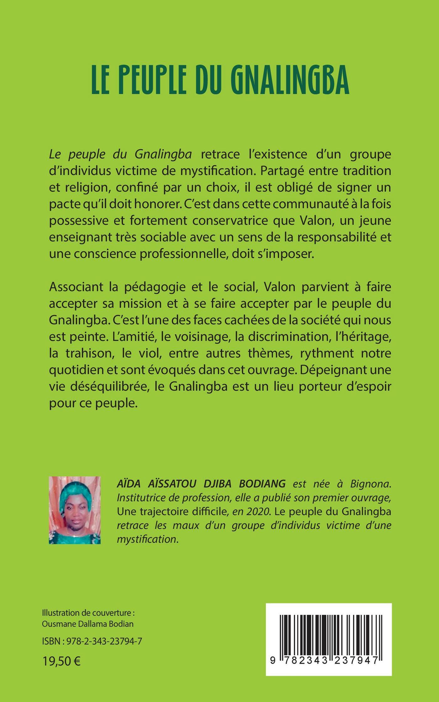 Le peuple du Gnalingba retrace l'existence d'un groupe d'individus victime de mystification. C'est dans cette communauté à la fois possessive et fortement conservatrice que Valon, un jeune enseignant très sociable et une conscience professionnelle, doit s'imposer. Associant la pédagogie et le social, Valon parvient à faire accepter sa mission et à se faire accepter par le peuple du Gnalingba. C'est l'une des faces cachées de la société qui nous est peinte. L'amitié, la discrimination, l'héritage, le viol, entre autres thèmes, rythment notre quotidien et sont évoqués dans cet ouvrage. Dépeignant une vie déséquilibrée, le Gnalingba est un lieu porteur d'espoir pour ce peuple.