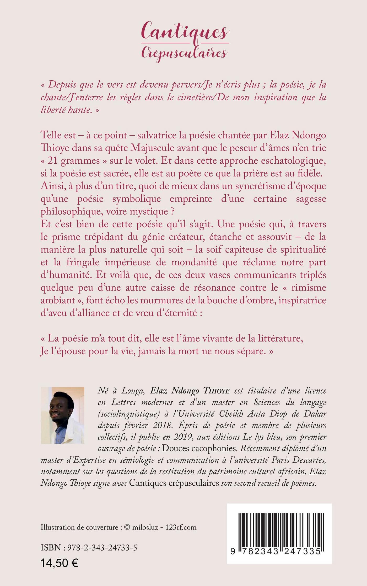 « Depuis que le vers est devenu pervers/Je n'écris plus ; la poésie, je la chante/J'enterre les règles dans le cimetière/De mon inspiration que la liberté hante. » Telle est salvatrice la poésie chantée par Elaz Ndongo Thioye dans sa quête Majuscule avant que le peseur d'âmes n'en trie « 21 grammes » sur le volet. Et dans cette approche eschatologique, si la poésie est sacrée, elle est au poète ce que la prière est au fidèle. Ainsi, à plus d'un titre, quoi de mieux dans un syncrétisme d'époque qu'une poésie symbolique empreinte d'une certaine sagesse philosophique, voire mystique ?