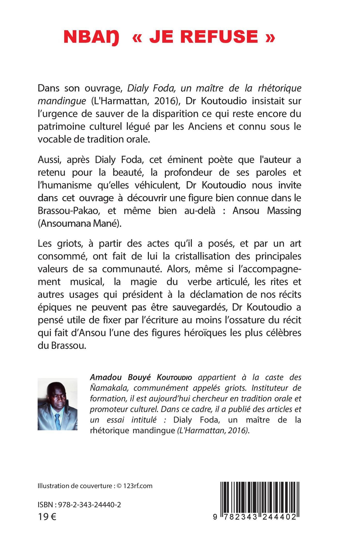 Dr Koutoudio nous invite dans cet ouvrage à découvrir une figure bien connue dans le Brassou-Pakao, et même bien au-delà : Ansou Massing (Ansoumana Mané). Les griots, à partir des actes qu'il a posés, et par un art consommé, ont fait de lui la cristallisation des principales valeurs de sa communauté. Alors, même si l'accompagnement musical, la magie du verbe articulé, les rites et autres usages qui président à la déclamation de nos récits épiques ne peuvent pas être sauvegardés, Dr Koutoudio a pensé utile de fixer par l'écriture au moins l'ossature du récit qui fait d'Ansou l'une des figures héroïques les plus célèbres du Brassou.
