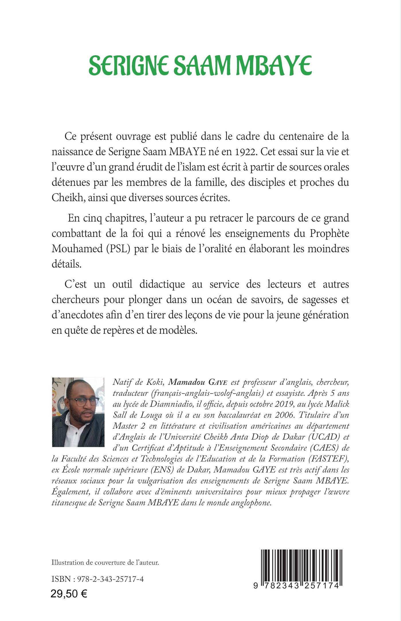 Publié dans le cadre du centenaire de la naissance de Serigne Saam MBAYE né en 1922, cet essai sur la vie et l'oeuvre d'un grand érudit de l'islam est écrit à partir de sources orales détenues par les membres de la famille, des disciples et proches du Cheikh, ainsi que diverses sources écrites. En cinq chapitres, l'auteur a pu retracer le parcours de ce grand combattant de la foi qui a rénové les enseignements du Prophète Mouhamed (PSL) par le biais de l'oralité en élaborant les moindres détails. C'est un outil didactique au service des lecteurs et autres chercheurs pour plonger dans un océan de savoirs, de sagesses et d'anecdotes afin d'en tirer des leçons de vie pour la jeune génération en quête de repères et de modèles.