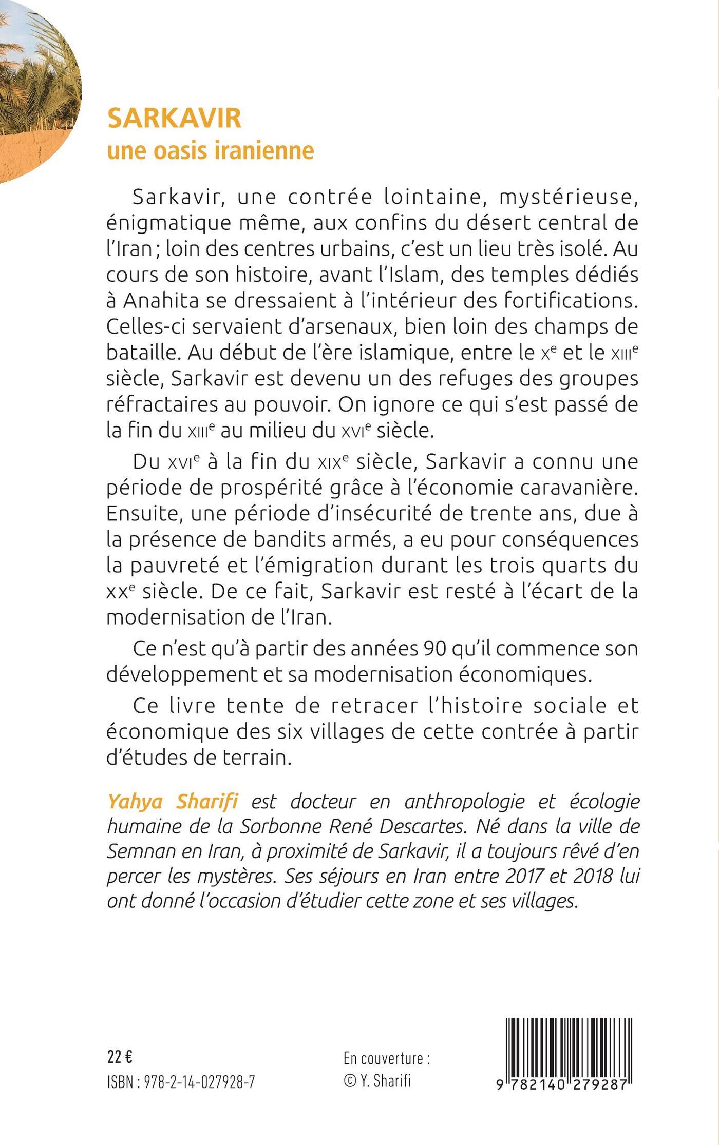 Sarkavir, une contrée lointaine, mystérieuse, énigmatique même, aux confins du désert central de l’Iran ; loin des centres urbains, c’est un lieu très isolé. Au cours de son histoire, avant l’Islam, des temples dédiés à Anahita se dressaient à l’intérieur des fortifications. Celles-ci servaient d’arsenaux, bien loin des champs de bataille. Au début de l’ère islamique, entre le Xe et le XIIIe siècle, Sarkavir est devenu un des refuges des groupes réfractaires au pouvoir. On ignore ce qui s’est passé de la fin du XIIIe au milieu du XVIe siècle. Du XVIe à la fin du XIXe siècle, Sarkavir a connu une période de prospérité grâce à l’économie caravanière. Ensuite, une période d’insécurité de trente ans, due à la présence de bandits armés, a eu pour conséquences la pauvreté et l’émigration durant les trois quarts du XXe siècle. De ce fait, Sarkavir est resté à l’écart de la modernisation de l’Iran. Ce n’est qu’à partir des années 90 qu’il commence son développement et sa modernisation économiques. Ce livre tente de retracer l’histoire sociale et économique des six villages de cette contrée à partir d’études de terrain.