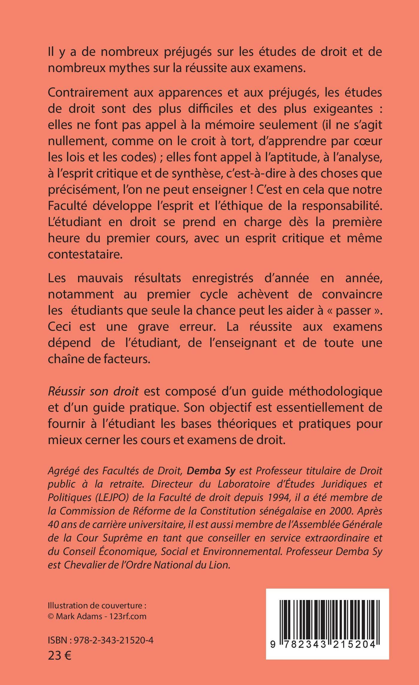 Il y a de nombreux préjugés sur les études de droit et de nombreux mythes sur la réussite aux examens. Les études de droit sont des plus difficiles et des plus exigeantes et ne font pas appel à la mémoire seulement ; elles font appel à l'aptitude, à l'analyse, à l'esprit critique et de synthèse, c'est-à-dire à des choses que précisément, l'on ne peut enseigner. Composé d'un guide méthodologique et d'un guide pratique, l'objectif de ce livre est essentiellement de fournir à l'étudiant les bases théoriques et pratiques pour mieux cerner les cours et examens de droit.