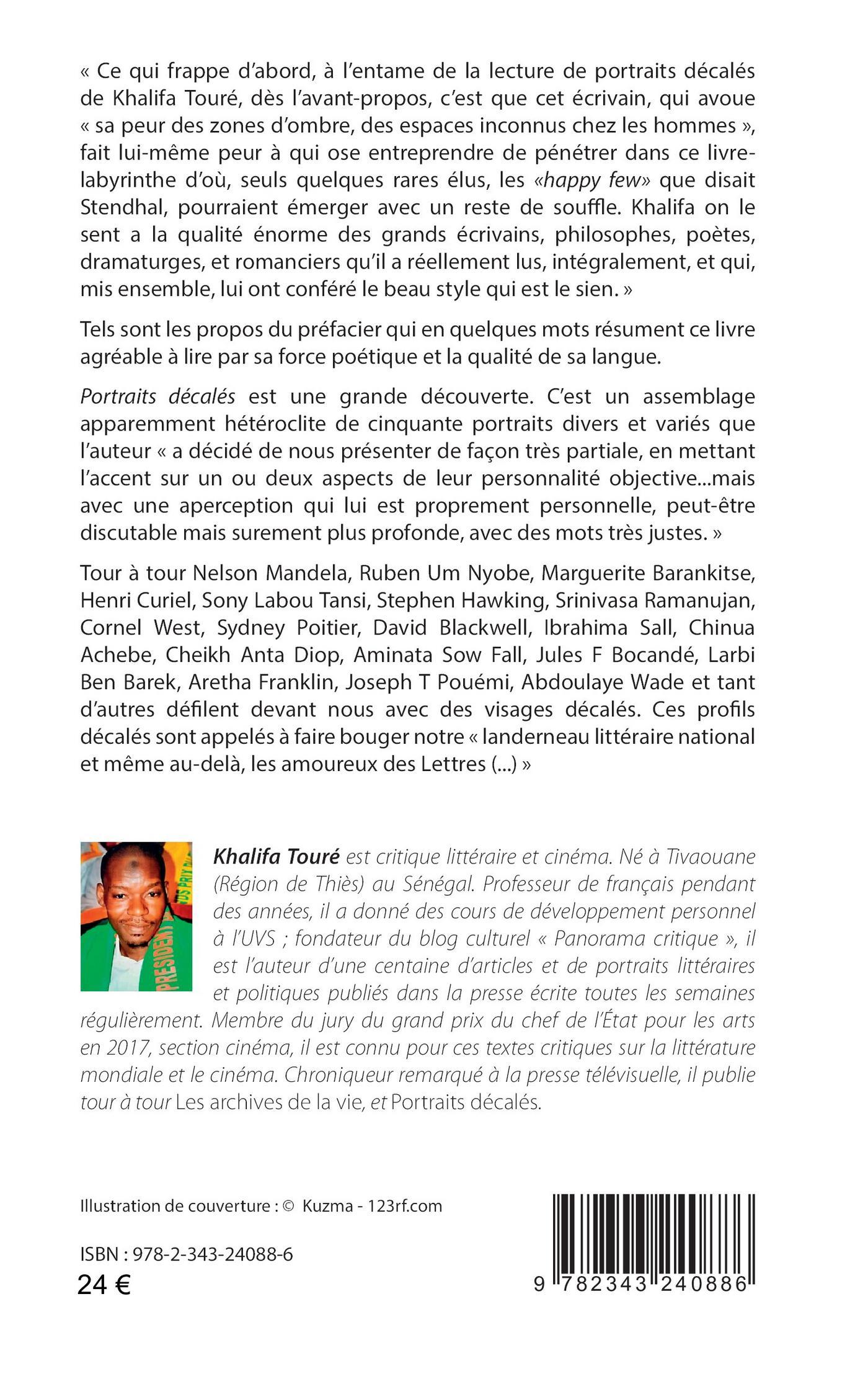 Portraits décalés est un assemblage apparemment hétéroclite de cinquante portraits divers et variés que l'auteur « a décidé de nous présenter de façon très partiale, en mettant l'accent sur un ou deux aspects de leur personnalité objective...mais avec une aperception qui lui est proprement personnelle, peut-être discutable mais surement plus profonde, avec des mots très justes. » Tour à tour Nelson Mandela, Ruben Um Nyobe, Marguerite Barankitse, Henri Curiel, Sony Labou Tansi, Stephen Hawking, Srinivasa Ramanujan, Sydney Poitier, David Blackwell, Ibrahima Sall, Chinua Achebe, Cheikh Anta Diop, Aminata Sow Fall, Jules F Bocandé, Larbi Ben Barek, Aretha Franklin, Joseph T Pouémi, Abdoulaye Wade et tant d'autres défilent devant nous avec des visages décalés. Ces profils décalés sont appelés à faire bouger notre « landerneau littéraire national et même au-delà, les amoureux des Lettres (...) »
