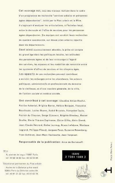 Cet ouvrage est, issu des travaux réalisés dans le cadre d'un programme de recherche "services urbains et personnes âgées dépendantes", initié par le Plan urbain et la Mire.