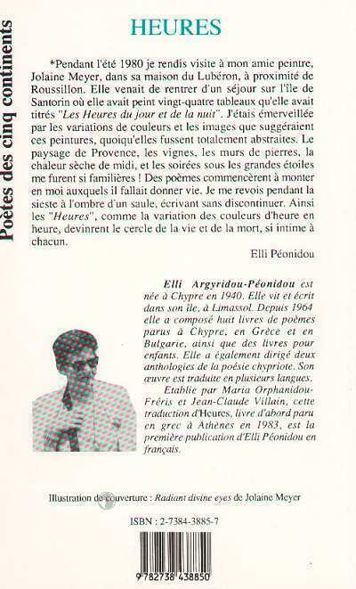 Pendant l'été 1980 je rendis visite à mon amie peintre, Jolaine Meyer, dans sa maison du Lubéron, à proximité de Roussillon. Elle venait de rentrer d'un séjour sur l'île de Santorin où elle avait peint vingt-quatre tableaux qu'elle avait titrés "Les Heures du jour et de la nuit". J'étais émerveillée par les variations de couleurs et les images que suggéraient ces peintures, quoiqu'elles fussent totalement abstraites. Le paysage de Provence, les vignes, les murs de pierres, la chaleur sèche de midi, et les soirées sous les grandes étoiles me furent si familières ! Des poèmes commencèrent à monter en moi auxquels il fallait donner vie. Je me revois pendant la sieste à l'ombre d'un saule, écrivant sans discontinuer. Ainsi les "Heures", comme la variation des couleurs d'heure en heure, devinrent le cercle de la vie et de la mort, si intime à chacun.