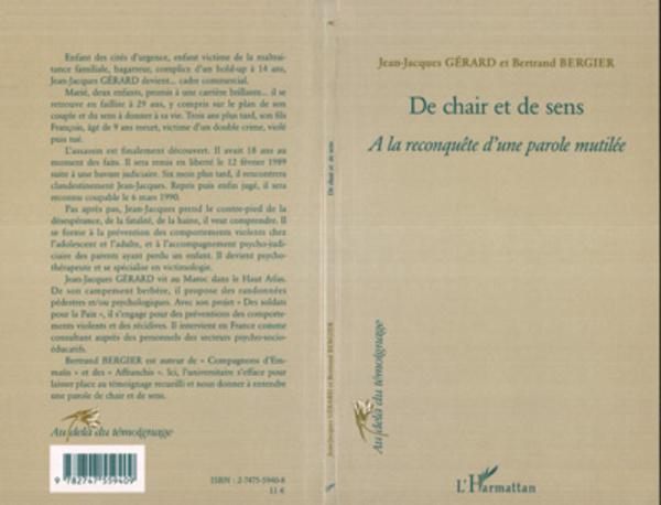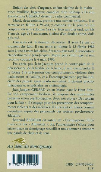 Enfant des cités d'urgence, enfant victime de la maltraitance familiale, bagarreur, complice d'un hold-up à 14 ans, Jean-Jacques Gérard devient cadre commercial. Marié, deux enfants, il se retrouve en faillite tant d'un point de vue familial que professionnel. Son fils meurt , victime d'un double crime, violé puis tué. Prenant le contre-pied de la désespérance et de la haine, Jean-Jacques Gérard devient psychothérapeute et se spécialise en victimologie. Bertrand Bergier est ici un universitaire qui s'efface pour laisser place au témoignage recueilli et nous donner une parole de chair et de sens.