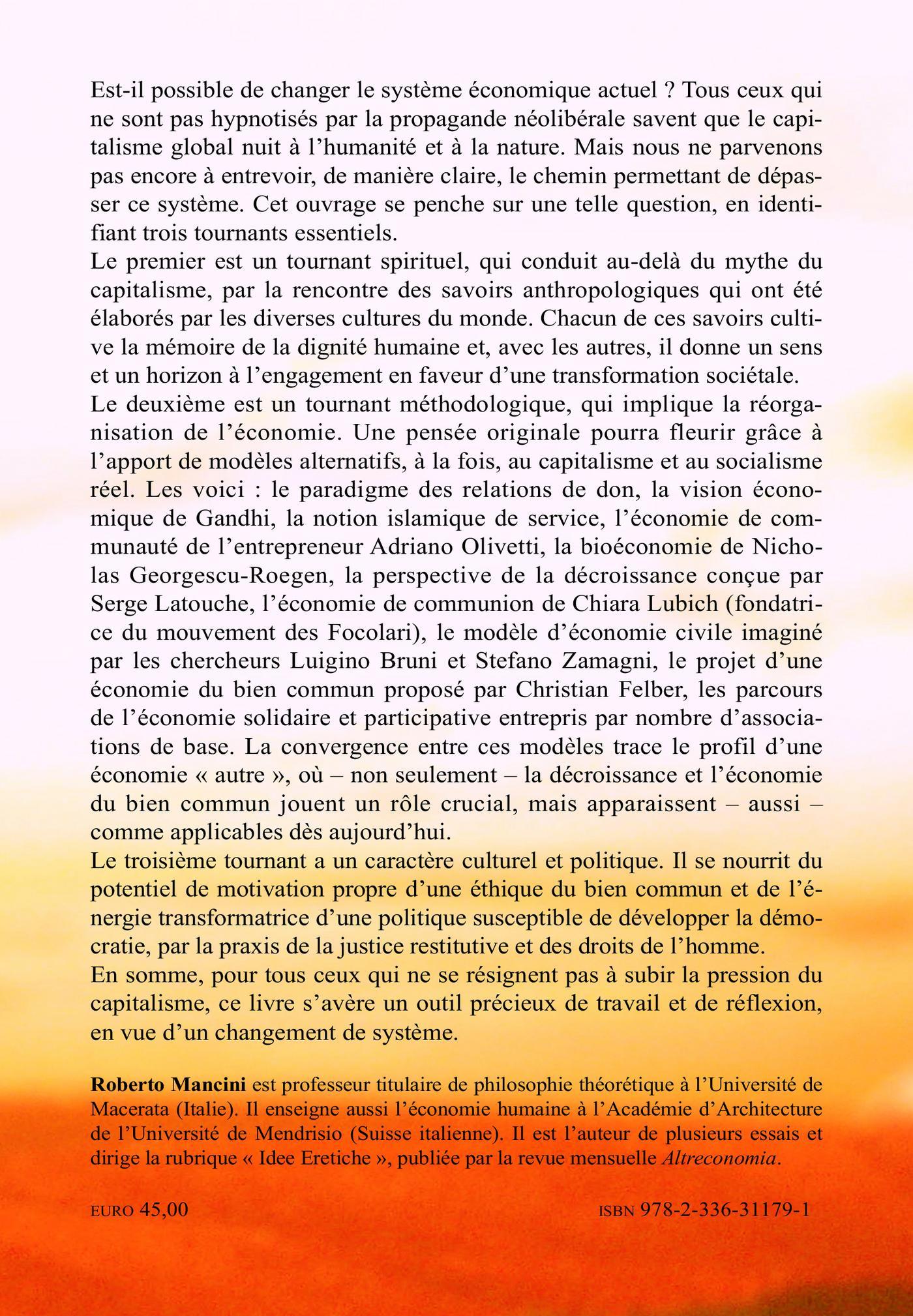 Est-il possible de changer le système économique actuel ? Tous ceux qui ne sont pas hypnotisés par la propagande néolibérale savent que le capitalisme global nuit à l'humanité et à la nature. Mais nous ne parvenons pas encore à entrevoir, de manière claire, le chemin permettant de dépasser ce système. Cet ouvrage se penche sur une telle question, en identifiant trois tournants essentiels : spirituel qui conduit au-delà du mythe du capitalisme, par la rencontre des savoirs anthropologiques ; méthodologique, qui implique la réorganisation de l'économie ; culturel et politique, qui se nourrit du potentiel de motivation propre à l'éthique du bien commun et de l'énergie transformatrice d'une politique susceptible de développer la démocratie.