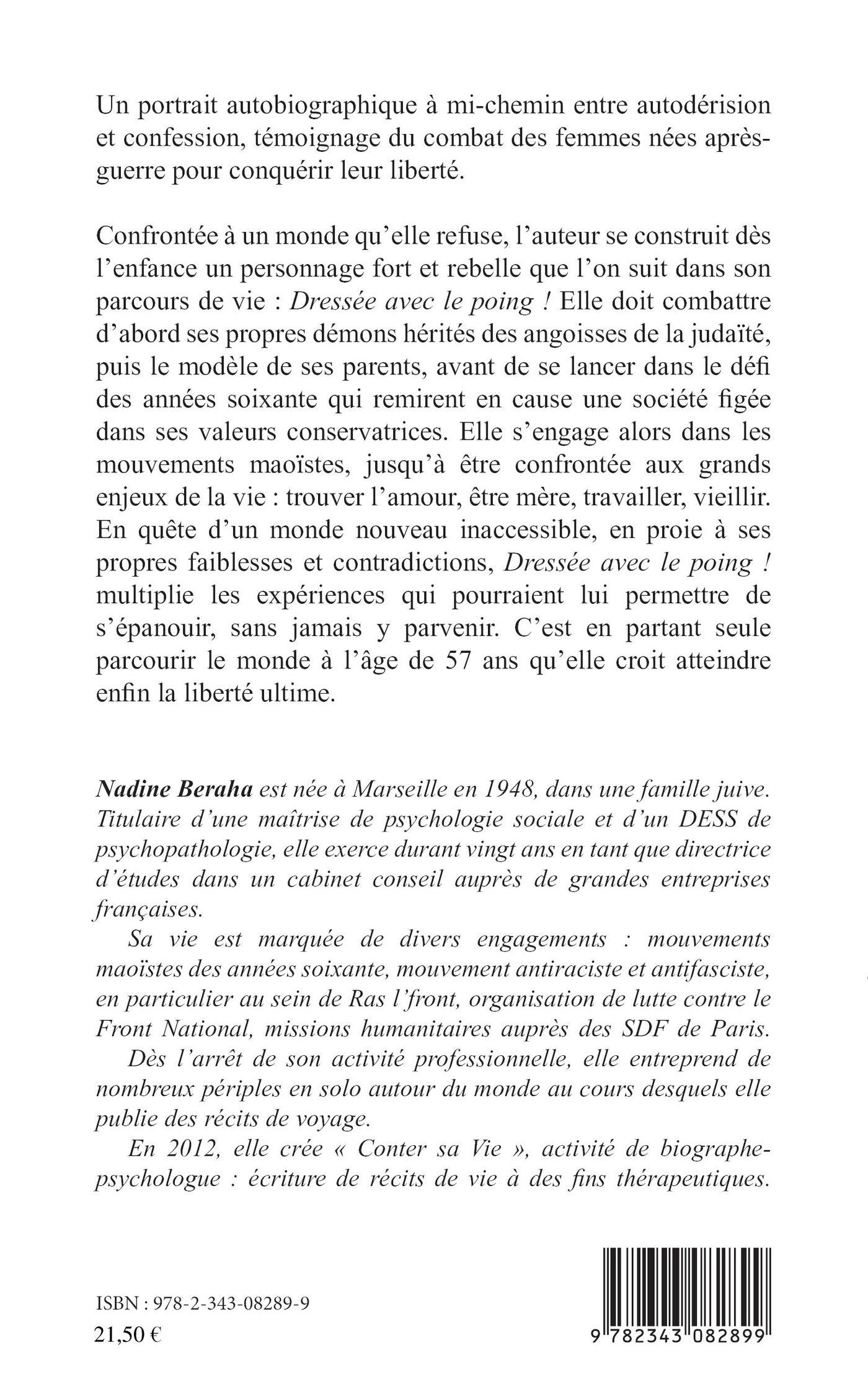Confrontée à un monde qu'elle refuse, l'auteur se construit dès l'enfance un personnage fort et rebelle que l'on suit dans son parcours de vie : Dressée avec le poing ! Elle doit combattre d'abord ses propres démons hérités des angoisses de la judaïté, puis le modèle de ses parents, avant de se lancer dans le défi des années soixante qui remirent en cause une société figée dans ses valeurs conservatrices. En quête d'un monde nouveau inaccessible, en proie à ses propres faiblesses et contradictions, Dressée avec le poing ! multiplie les expériences qui pourraient lui permettre de s'épanouir, sans jamais y parvenir. C'est en partant seule parcourir le monde à l'âge de 57 ans qu'elle croit atteindre enfin la liberté ultime.