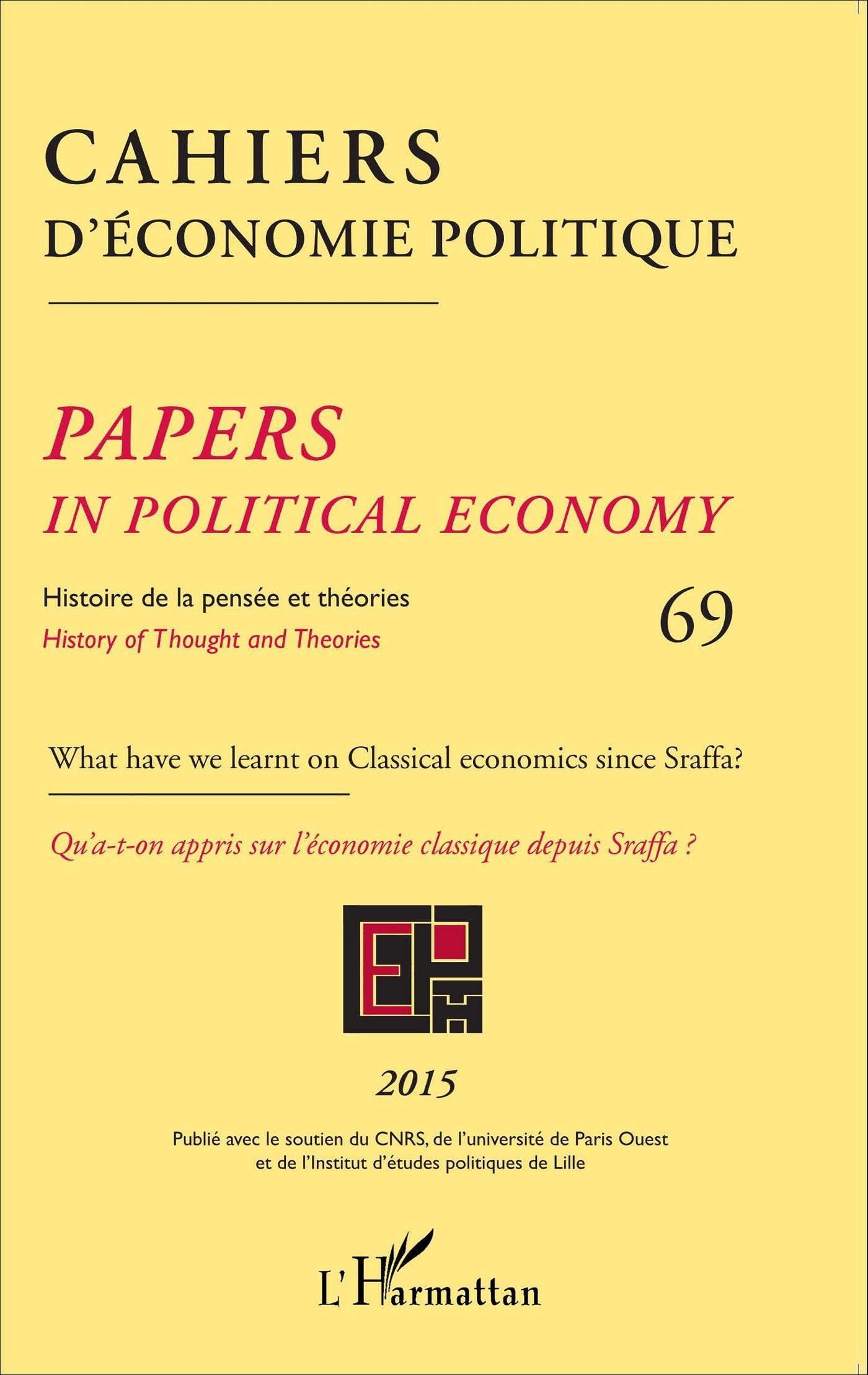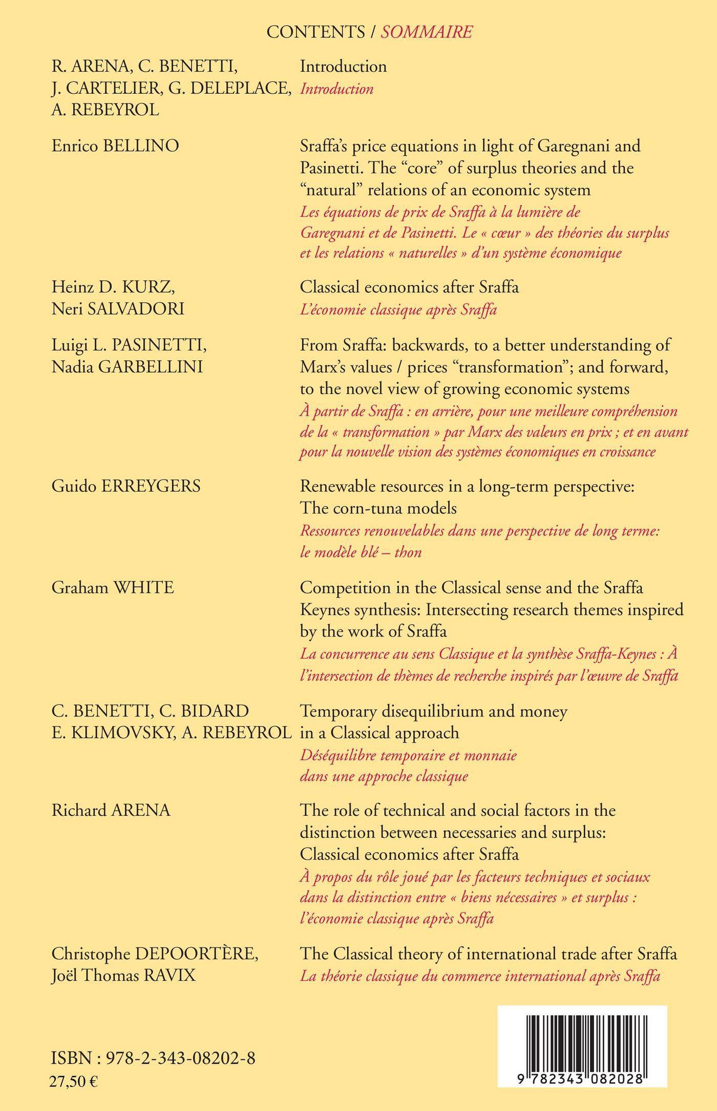 Sommaire : Les équations de prix de Sraffa à la lumière de Garegnani et de Pasinetti. Le « cur » des théories du surplus et les relations « naturelles » d'un système économique / L'économie classique après Sraffa / A partir de Sraffa : en arrière pour une meilleure compréhension de la « transformation » par Marx des valeurs en prix ; et en avant pour la nouvelle vision des systèmes économiques en croissance / Ressources renouvelables dans une perspective de long terme : le modèle blé thon / La concurrence au sens Classique et la synthèse Sraffa-Keynes : A l'intersection de thèmes de recherche inspirés par l'uvre de Sraffa / Déséquilibre temporaire et monnaie dans une approche classique / A propos du rôle joué par les facteurs techniques et sociaux dans la distinction entre « biens nécessaires » et surplus : l'économie classique après Sraffa / La théorie classique du commerce international après Sraffa
