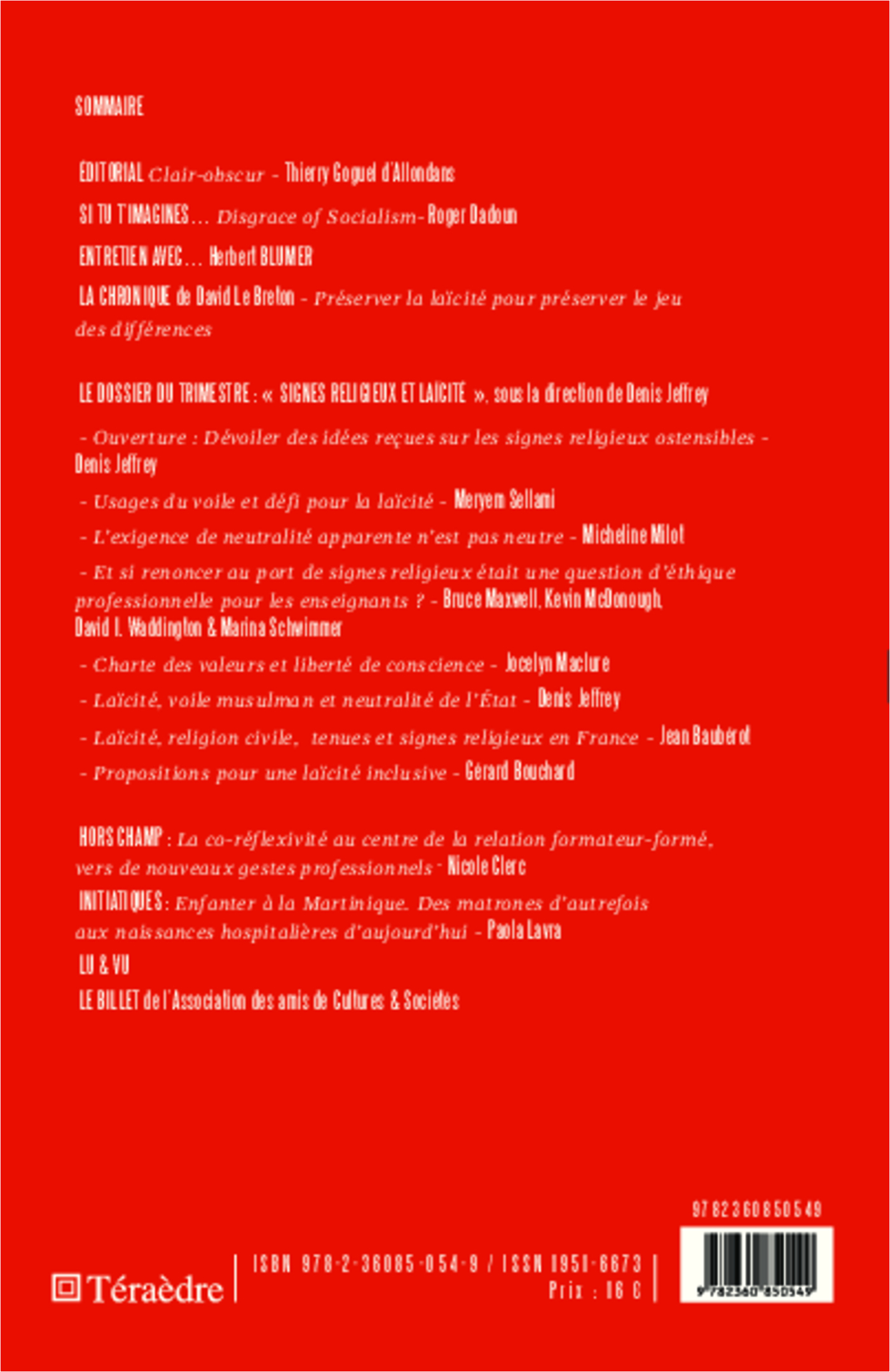 Hélène Romano, Christine Fawer Caputo, Jocelyn Lachance, Martin Julier-Costes, Florence Quinche, Martine Roberge, Denis Jeffrey, Daniel Oppenheim, Muriel Derome, Aurélie Lefebvre, Khémi Ferrey, David le Breton, Jean-François Cauchie, Patrice Corriveau, Bryan Hamel