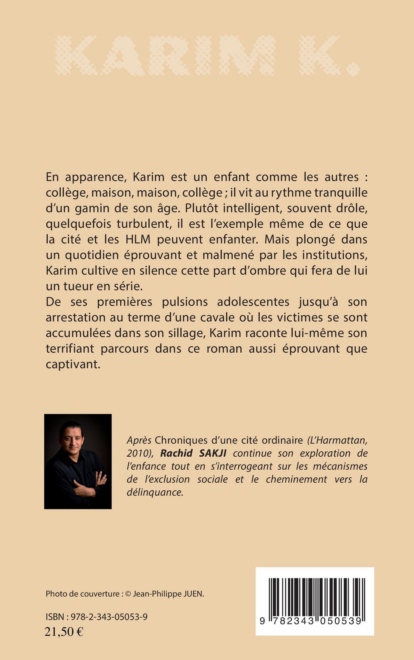 En apparence, Karim est un enfant comme les autres : collège, maison, maison, collège ; il vit au rythme tranquille d'un gamin de son âge. Plutôt intelligent, souvent drôle, quelquefois turbulent, il est l'exemple même de ce que la cité et les HLM peuvent enfanter. Mais plongé dans un quotidien éprouvant et malmené par les institutions, Karim cultive en silence cette part d'ombre qui fera de lui un tueur en série. De ses premières pulsions adolescentes jusqu'à son arrestation au terme d'une cavale où les victimes se sont accumulées dans son sillage, Karim raconte lui-même son terrifiant parcours dans ce roman aussi éprouvant que captivant.