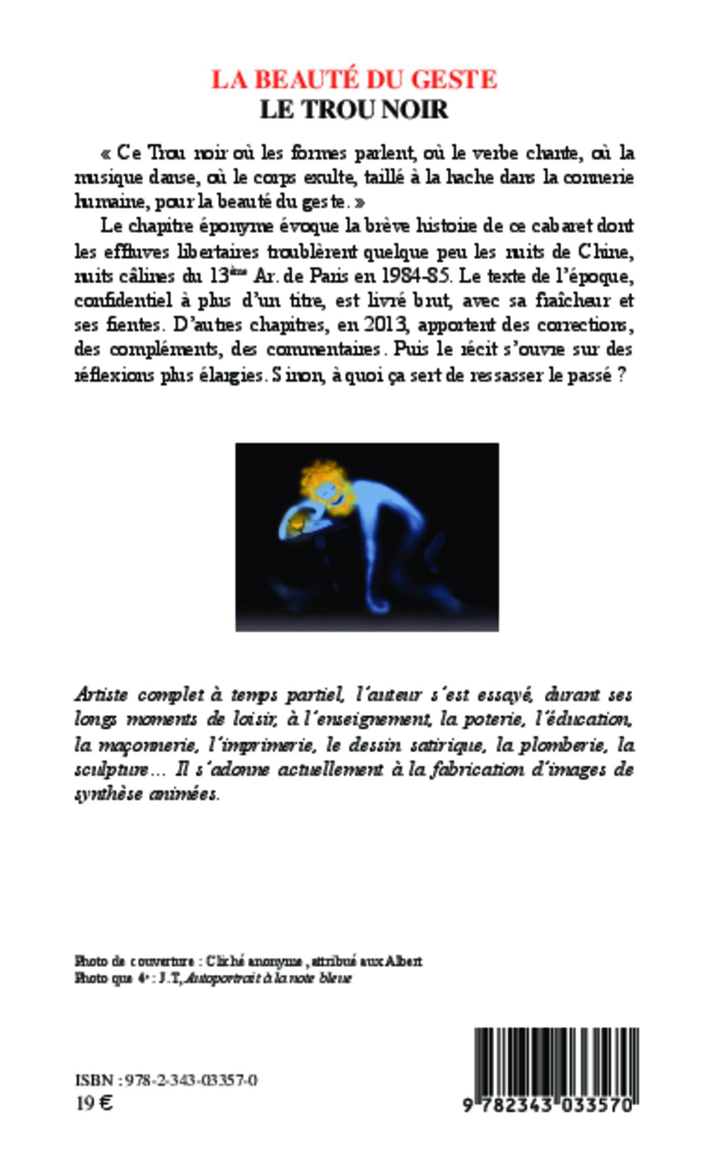 « Ce Trou noir où les formes parlent, où le verbe chante, où la musique danse, où le corps exulte, taillé à la hache dans la connerie humaine, pour la beauté du geste. » Le chapitre éponyme évoque la brève histoire de ce cabaret dont les effluves libertaires troublèrent quelque peu les nuits de Chine, nuits câlines du 13ème Ar. de Paris en 1984-85. Le texte de l'époque, confidentiel à plus d'un titre, est livré brut, avec sa fraîcheur et ses fientes. D'autres chapitres, en 2013, apportent des corrections, des compléments, des commentaires. Puis le récit s'ouvre sur des réflexions plus élargies. Sinon, à quoi ça sert de ressasser le passé ?