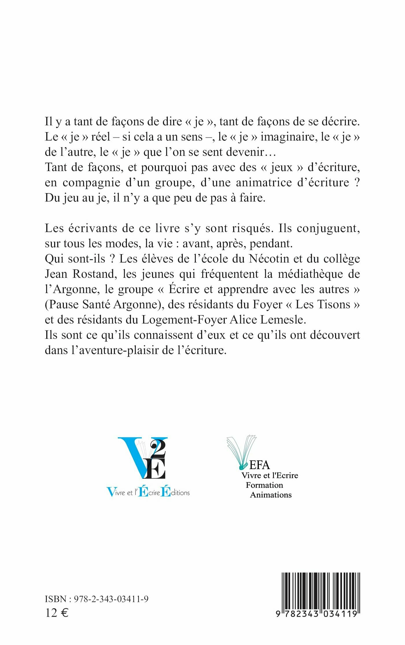 Il y a tant de façons de dire "je", tant de façons de se décrire. Les élèves de l'école du Nécotin et du collège Jean Rostand, les jeunes qui fréquentent la médiathèque de l'Argonne, le groupe "Ecrire et apprendre avec les autres", des résidants du Foyer "Les Tisons" et du Logement-Foyer Alice Lemesle se sont risqués au "jeu" de l'écriture. Entre le "je" réel, le "je" imaginaire, le "je" de l'autre et le "je" que l'on se sent devenir, ils sont ce qu'ils connaissent d'eux et ce qu'ils ont découvert dans l'aventure-plaisir de l'écriture.