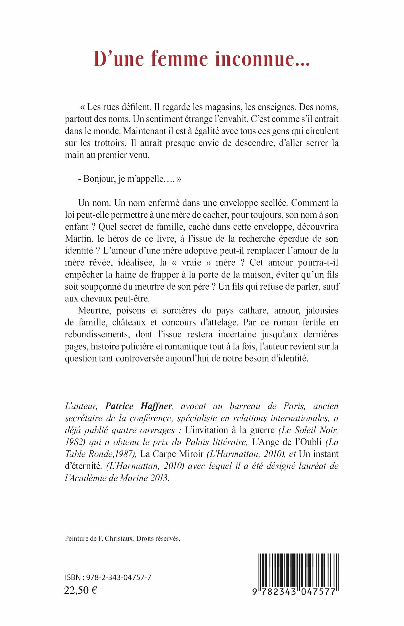 Un nom. Un nom enfermé dans une enveloppe scellée. Comment la loi peut-elle permettre à une mère de cacher, pour toujours, son nom à son enfant ? Quel secret de famille, caché dans cette enveloppe, découvrira Martin, le héros de ce livre, à l'issue de la recherche éperdue de son identité ? L'amour d'une mère adoptive peut-il remplacer celui de la mère rêvée, idéalisée, la "vraie mère" ? Cet amour pourra-t-il empêcher la haine de frapper à la porte de la maison, éviter qu'un fils soit soupçonné du meurtre de son père ? Un fils qui refuse de parler, sauf aux chevaux peut-être.