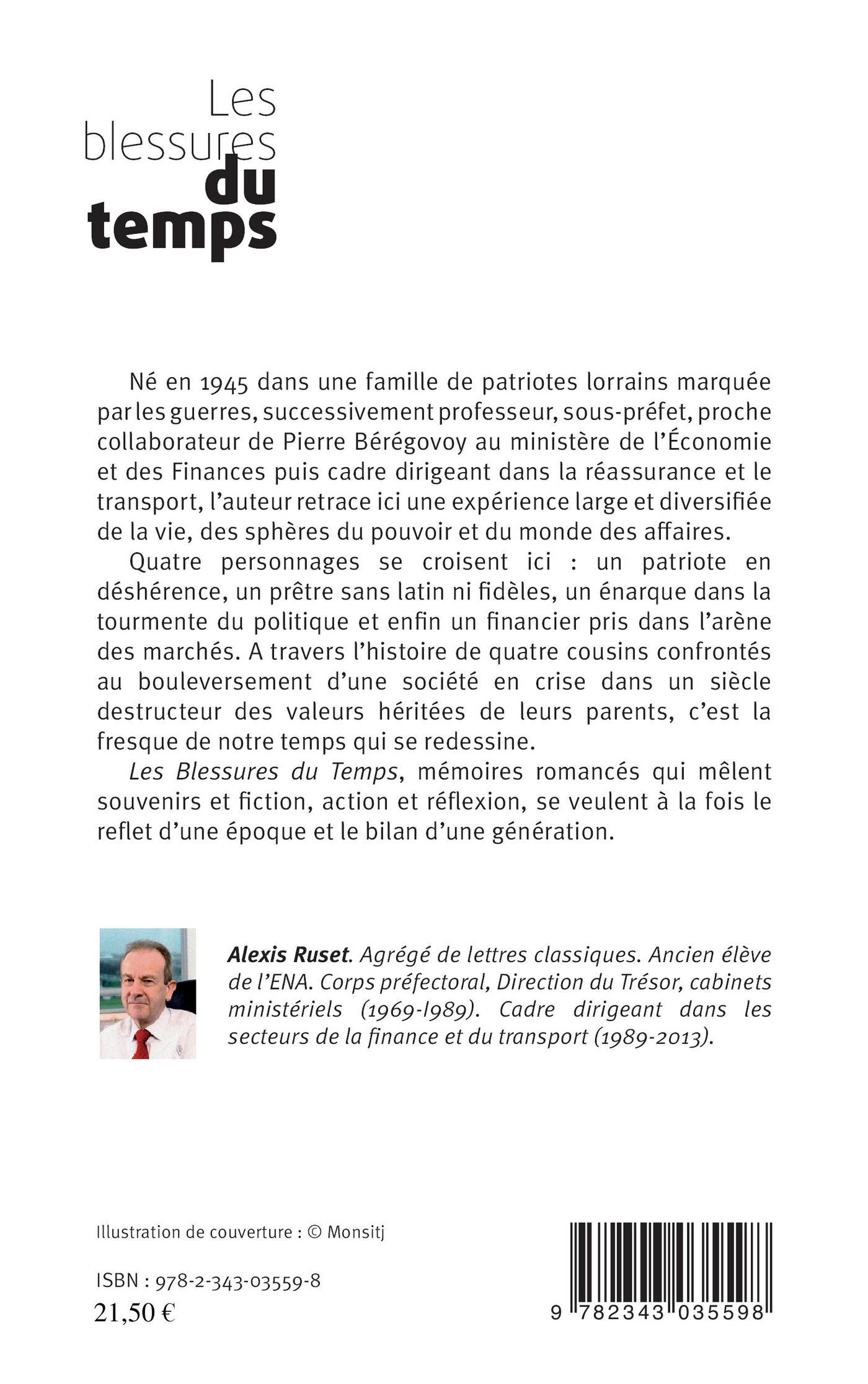 Quatre personnages se croisent ici : un patriote en déshérence, un prêtre sans latin ni fidèles, un énarque dans la tourmente du politique et enfin un financier pris dans l'arène des marchés. A travers l'histoire de quatre cousins confrontés au bouleversement d'une société en crise dans un siècle destructeur des valeurs héritées de leurs parents, c'est la fresque de notre temps qui se redessine. Les Blessures du Temps, mémoires romancés qui mêlent souvenirs et fiction, action et réflexion, se veulent à la fois le reflet d'une époque et le bilan d'une génération.