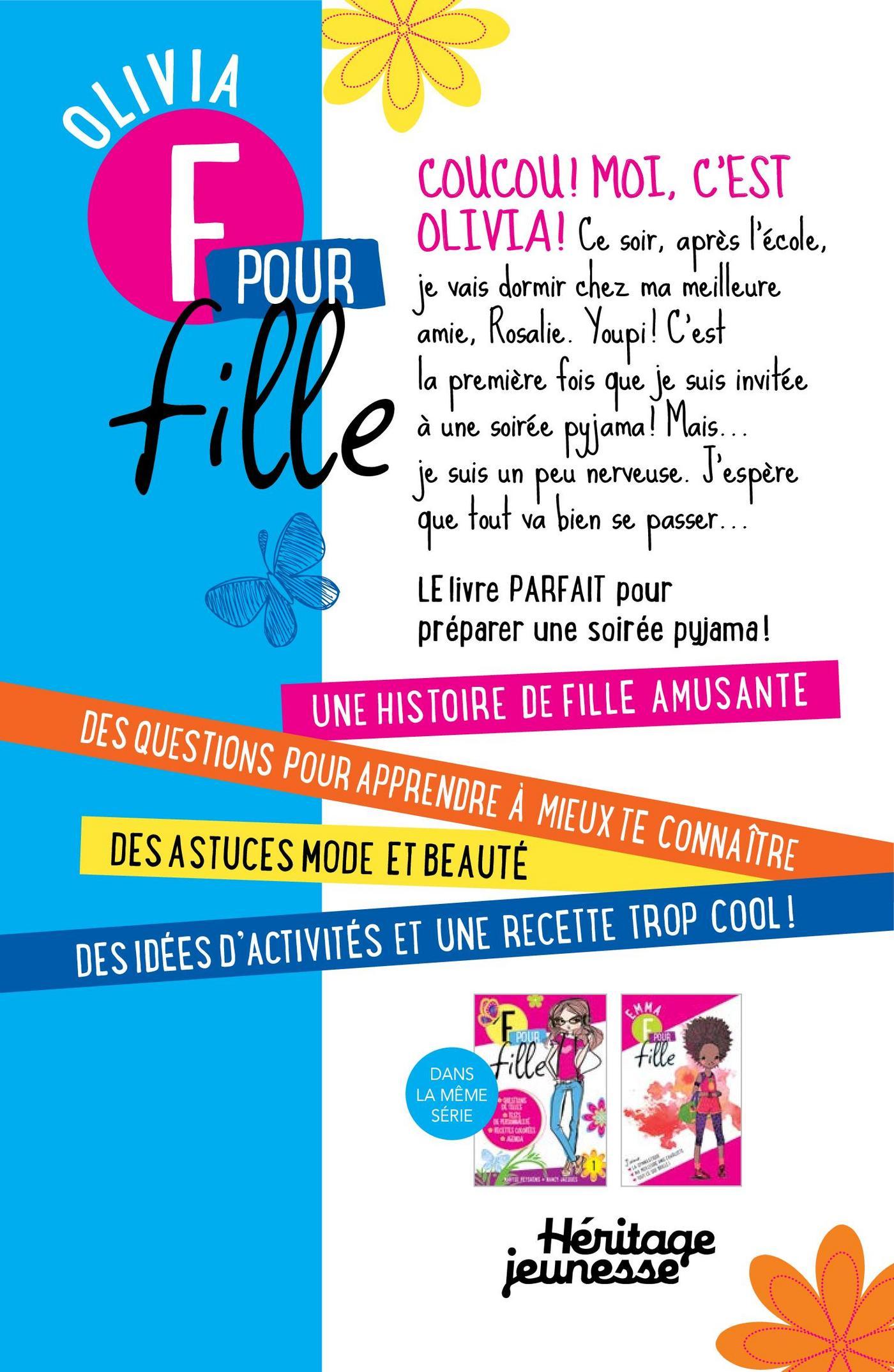 Coucou, moi c’est Olivia! Ce soir, après l’école, je vais dormir chez ma meilleure amie Rosalie. Youpi, c’est la première fois que je suis invitée à une soirée pyjama! Mais... et si la soirée tournait à la catastrophe? J’ai tellement peur que tout aille de travers... En plus, la mère de Rosalie est vraiment sévère... Je vais peut-être inventer une excuse pour rentrer à la maison finalement. Oui... mais je ne peux vraiment pas faire ça à Rosalie... c’est ma meilleure amie après tout! Bon, ok, c’est décidé, je respire par le nez!F pour fille : DES ROMANS parfaits pour toi et tes amies!- Une histoire de fille amusante;- Des questionnaires pour apprendre à te connaître à remplir avec tes amies; - Des astuces mode et beauté;- Des idées d’activités et des recettes trop cool!