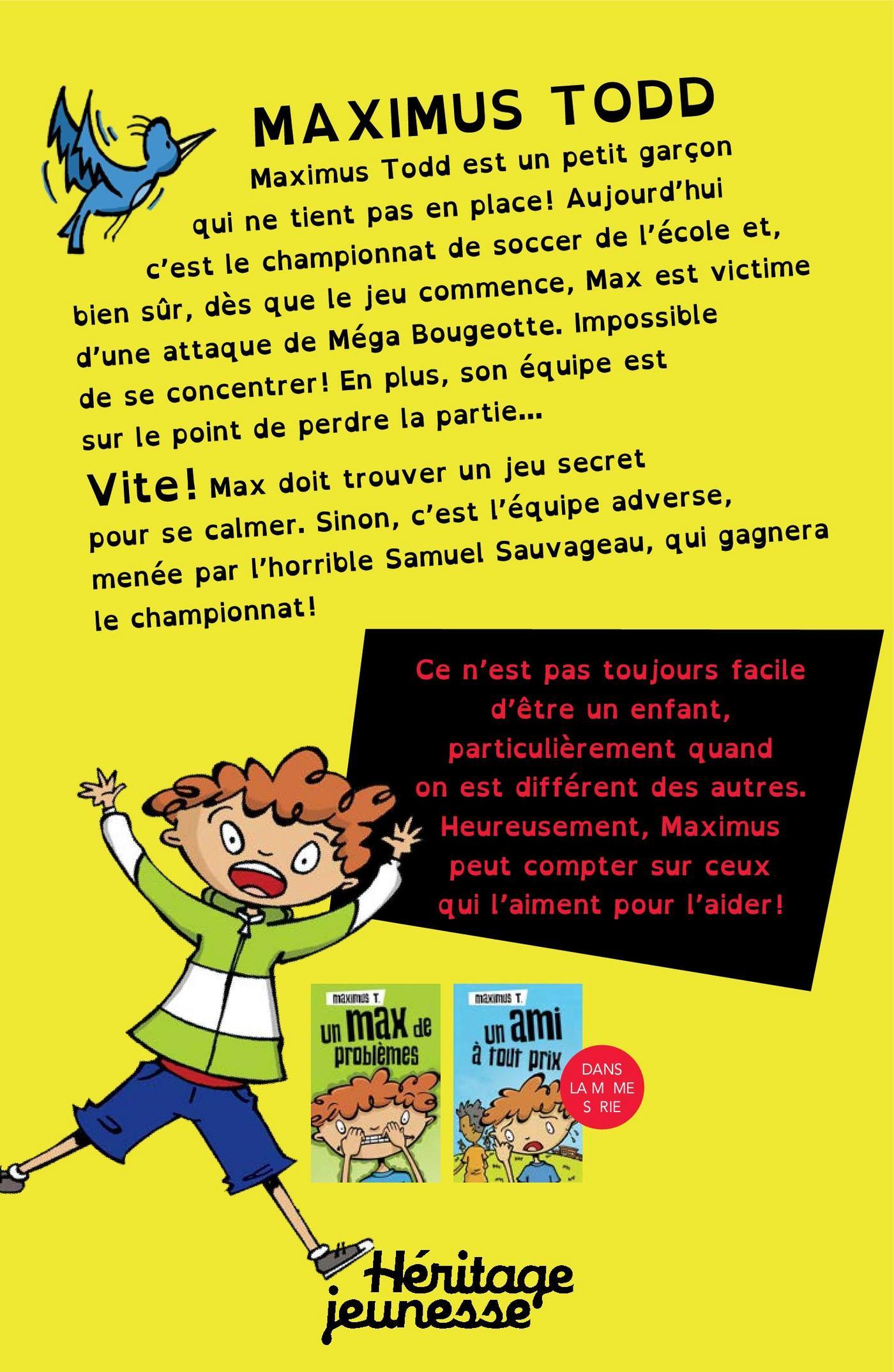C’est le championnat de soccer de l’école et bien sûr, dès que la partie commence, Maximus est victime d’un cas extrême de Méga Bougeotte. Impossible de se concentrer! Pire, il fait perdre des points à son équipe! Vite Max doit trouver un jeu secret qui le sortira de ce mauvais pas. Sinon c’est l’équipe adverse menée par l’horrible Samuel Sauvageau qui gagnera le championnat!À propos de la sérieMaximus est un enfant différent, aux prises avec plusieurs troubles et difficultés. Il doit relever de nombreux défis au quotidien et particulièrement à l’école. Grâce à son intelligence et à sa créativité, ainsi qu’à l’appui de ses amis et d’adultes bienveillants, il parvient à s’adapter à son environnement et même à connaître le succès à l’école. Un exemple positif pour les enfants qui se sentent parfois seuls avec leurs différences…