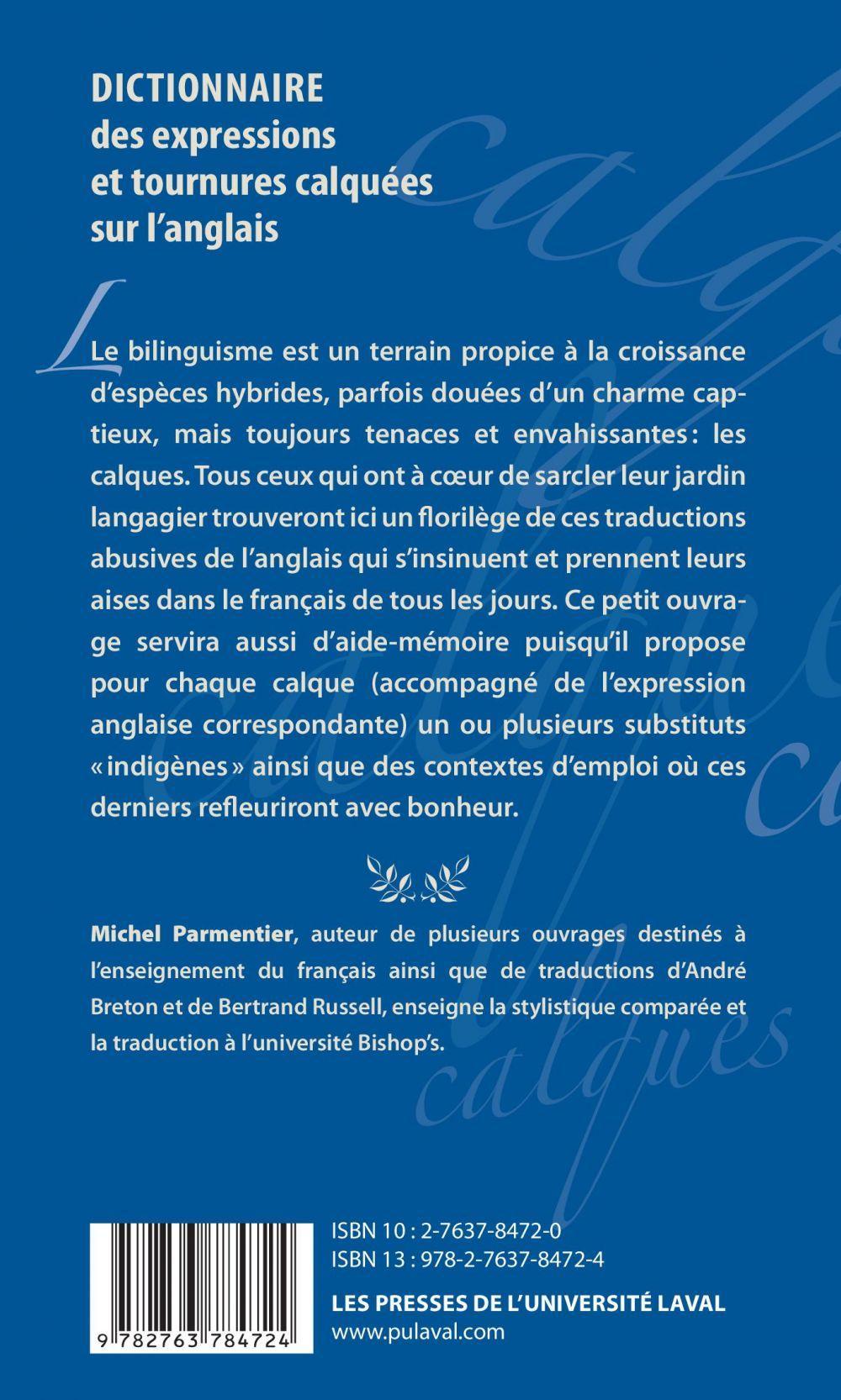 Le bilinguisme est un terrain propice à la croissance d’espèces hybrides, parfois douées d’un charme captieux, mais toujours tenaces et envahissantes : les calques. Tous ceux qui ont à cœur de sarcler leur jardin langagier trouveront ici un florilège de ces traductions abusives de l’anglais qui s’insinuent et prennent leurs aises dans le français de tous les jours. Ce petit ouvrage servira aussi d’aide-mémoire puisqu’il propose pour chaque calque (accompagné de l’expression anglaise correspondante) un ou plusieurs substituts « indigènes » ainsi que des contextes d’emploi où ces derniers refleuriront avec bonheur.