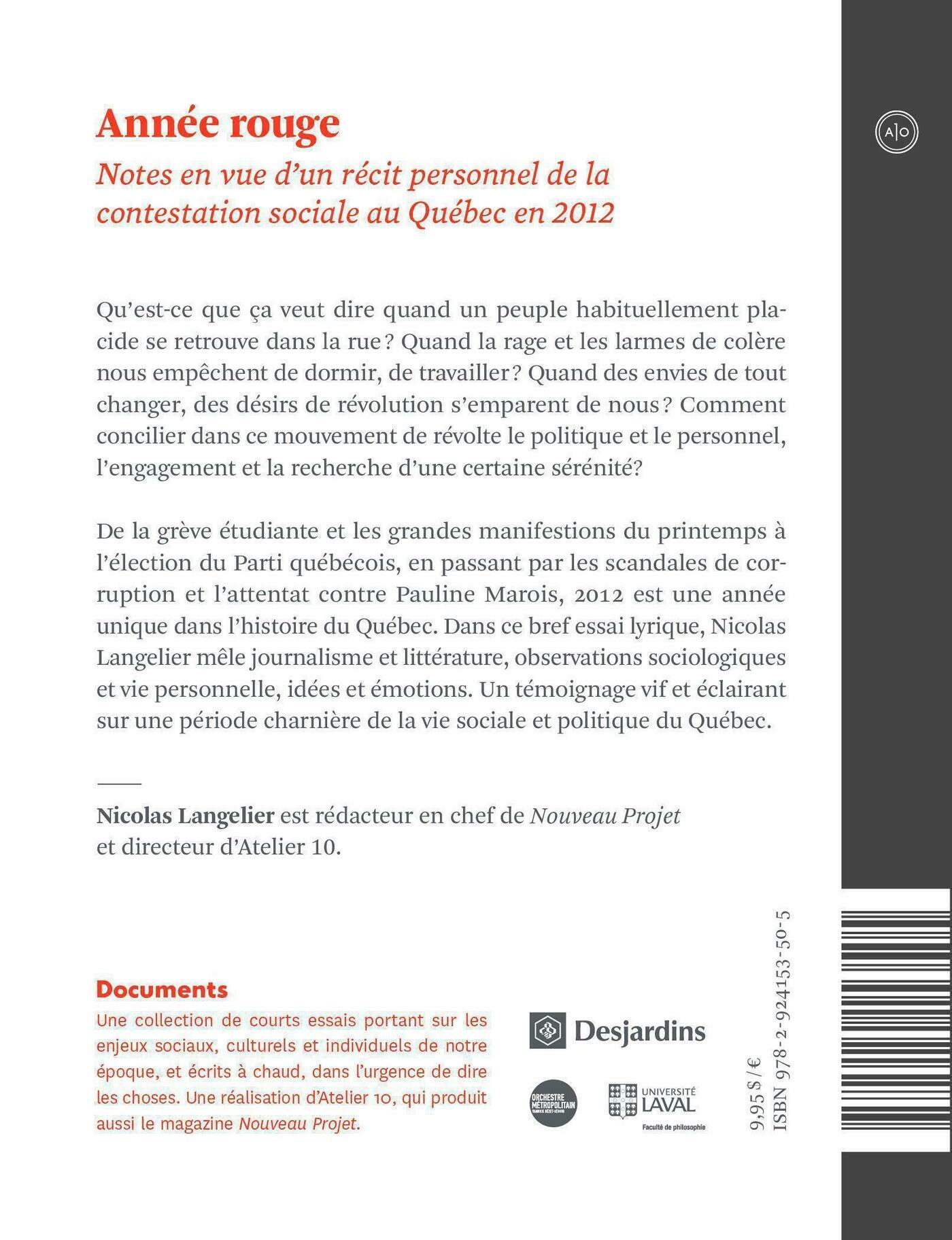 Qu'est-ce que ça veut dire quand un peuple habituellement placide se retrouve dans la rue? Quand la rage et les larmes de colère nous empêchent de dormir, de travailler? Quand des envies de tout changer, des désirs de révolution s'emparent de nous? Comment concilier dans ce mouvement de révolte le politique et le personnel, l'engagement et la recherche d'une certaine sérénité? De la grève étudiante et les grandes manifestations du printemps à l'élection du Parti québécois, en passant par les scandales de corruption et l'attentat contre Pauline Marois, 2012 est une année unique dans l'histoire du Québec. Dans ce bref essai lyrique, Nicolas Langelier mêle journalisme et littérature, observations sociologiques et vie personnelle, idées et émotions. Un témoignage vif et éclairant sur une période charnière de la vie sociale et politique du Québec.
