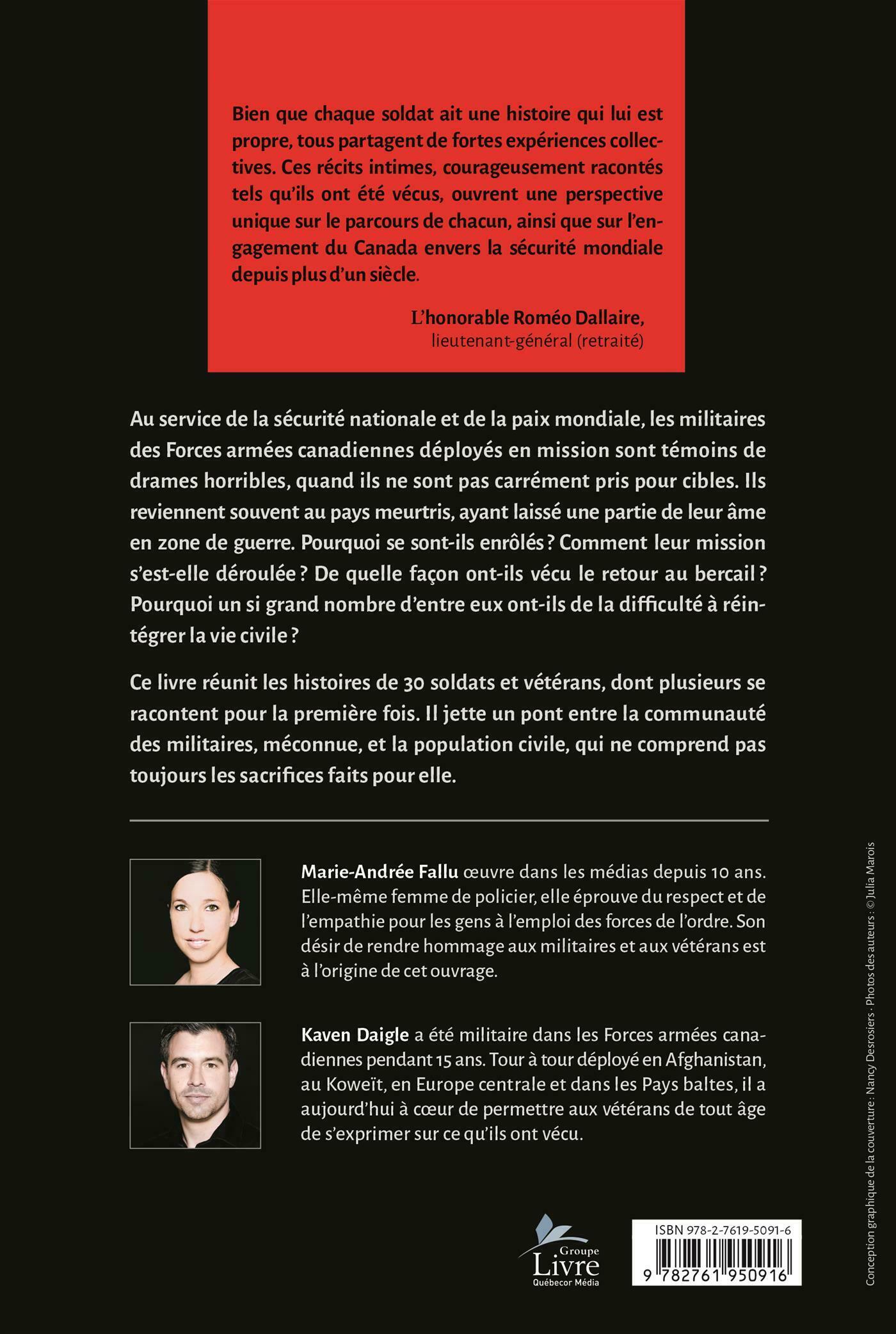 .Ce livre réunit les histoires de 30 soldats et vétérans, dont plusieurs se racontent pour la première fois. Il jette un pont entre la communauté des militaires, méconnue, et la population civile, qui ne comprend pas toujours les sacrifices faits pour elle.
