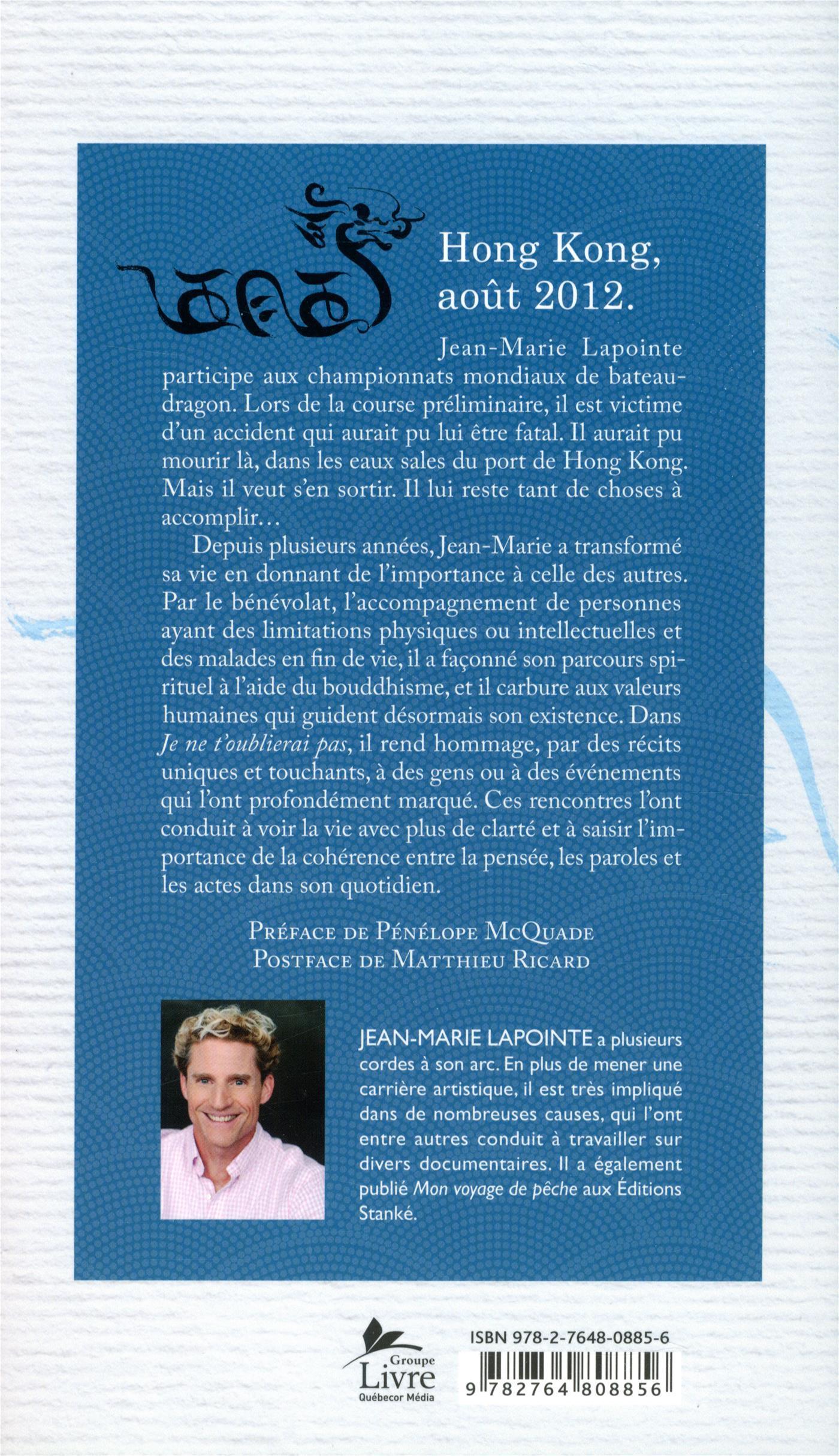 Jean-Marie Lapointe a transformé sa vie en donnant de l'importance à celle des autres. Par le bouddhisme et l'accompagnement de personnes mourantes ou ayant une déficience intellectuelle, le comédien, animateur, producteur, musicien et conférencier a façonné son propre parcours spirituel et les valeurs profondément humaines qui guident désormais son existence. Son ouvrage Je ne t'oublierai pas dévoile une quinzaine de récits uniques et touchants de gens qui ont marqué l'auteur et qui sont parvenus à mettre son âme à nu. Ces rencontres l'ont conduit à se questionner sur l'attitude à développer pour voir la vie avec plus de clarté, pour saisir l'importance de la cohérence entre la pensée, les paroles et les actes et pour intégrer cette discipline dans son quotidien.