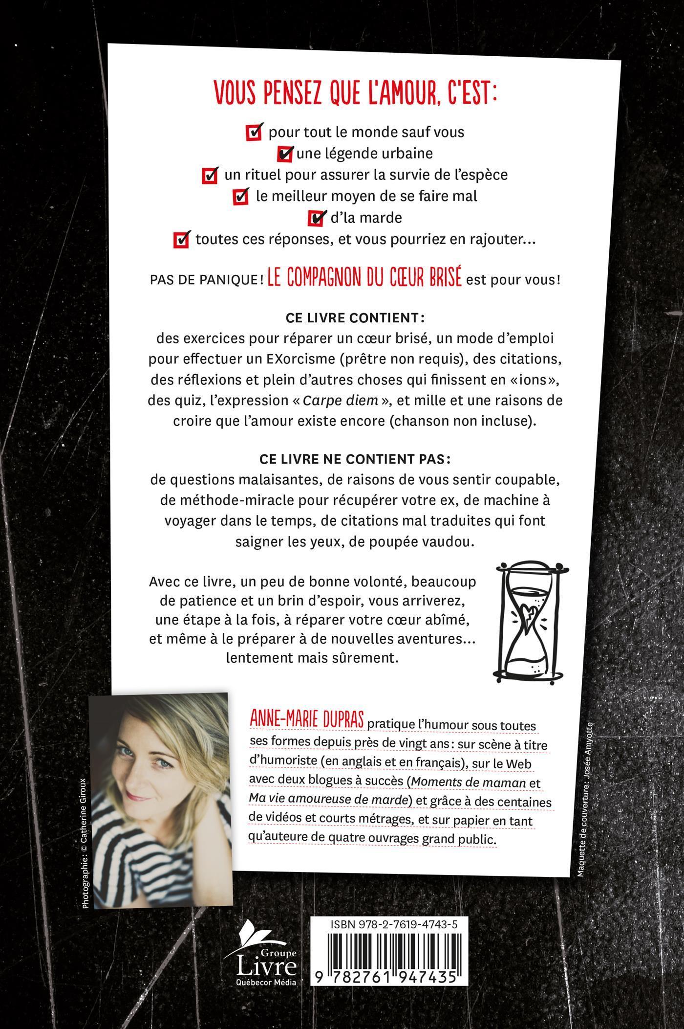 de questions malaisantes, de raisons de vous sentir coupable, de méthode-miracle pour récupérer votre ex, de machine à voyager dans le temps, de citations mal traduites qui font saigner les yeux, de poupée vaudou. Avec ce livre, un peu de bonne volonté, beaucoup de patience et un brin d'espoir, vous arriverez, une étape à la fois, à réparer votre coeur abîmé, et même à le préparer à de nouvelles aventures… lentement mais sûrement.