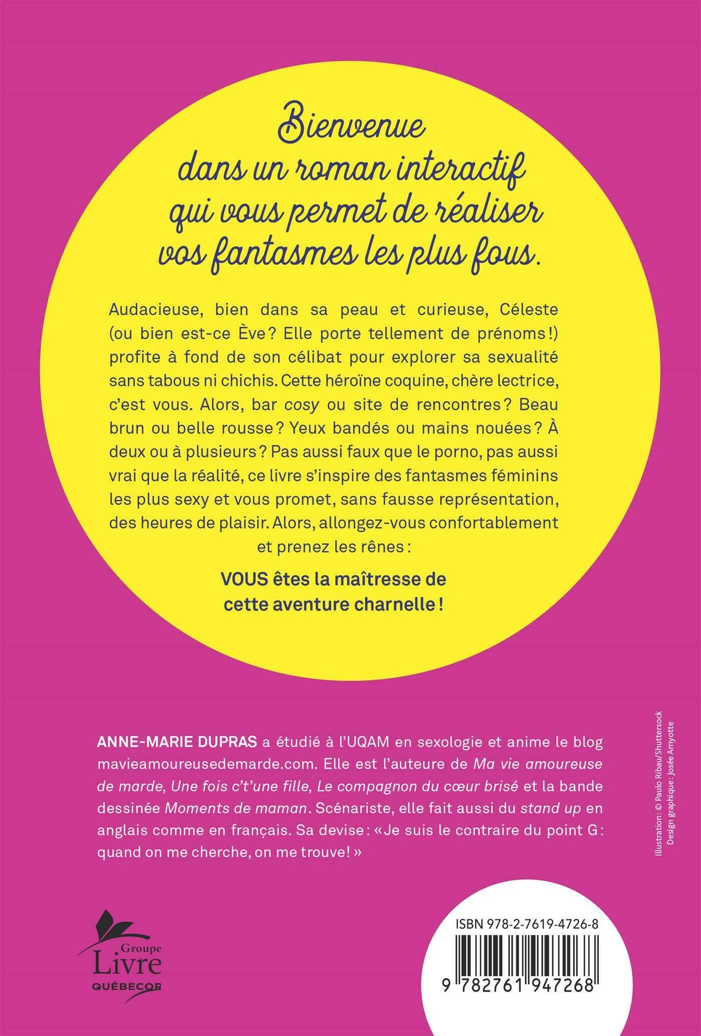 Audacieuse, bien dans sa peau et curieuse, Céleste (ou bien est-ce Ève? Elle porte tellement de prénoms!) profite à fond de son célibat pour explorer sa sexualité sans tabous ni chichis. Cette héroïne coquine, chère lectrice, c'est vous. Alors, bar cosy ou site de rencontres? Beau brun ou belle rousse? Yeux bandés ou mains nouées? À deux ou à plusieurs? Pas aussi faux que le porno, pas aussi vrai que la réalité, ce livre s'inspire des fantasmes féminins les plus sexy et vous promet, sans fausse représentation, des heures de plaisir.