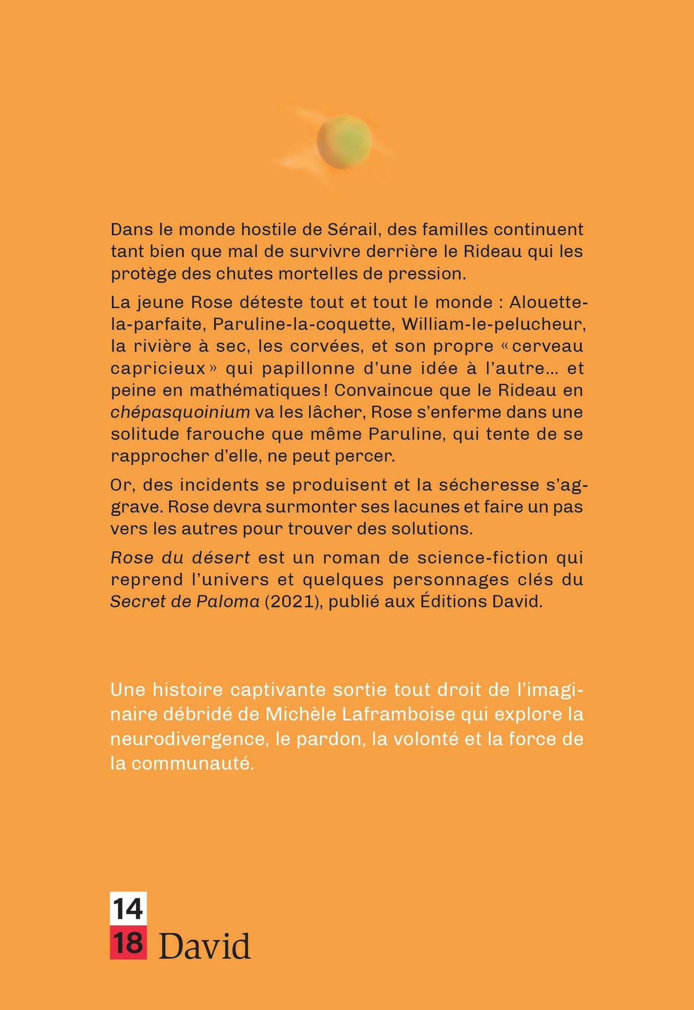 Dans le monde hostile de Sérail, des familles continuent tant bien que mal de survivre derrière le Rideau qui les protège des chutes mortelles de pression.La jeune Rose déteste tout et tout le monde : Alouette-la-parfaite, Paruline-la-coquette, William-le-pelucheur, la rivière à sec, les corvées, et son propre « cerveau capricieux » qui papillonne d’une idée à l’autre… et peine en mathématiques ! Convaincue que le Rideau en chépasquoinium va les lâcher, Rose s’enferme dans une solitude farouche que même Paruline, qui tente de se rapprocher d’elle, ne peut percer.Or, des incidents se produisent et la sécheresse s’aggrave. Rose devra surmonter ses lacunes et faire un pas vers les autres pour trouver des solutions.Rose du désert est un roman de science-fiction qui reprend l’univers et quelques personnages clés du Secret de Paloma (2021), publié aux Éditions David.Une histoire captivante sortie tout droit de l’imaginaire débridé de Michèle Laframboise qui explore la neurodivergence, le pardon, la volonté et la force de la communauté.