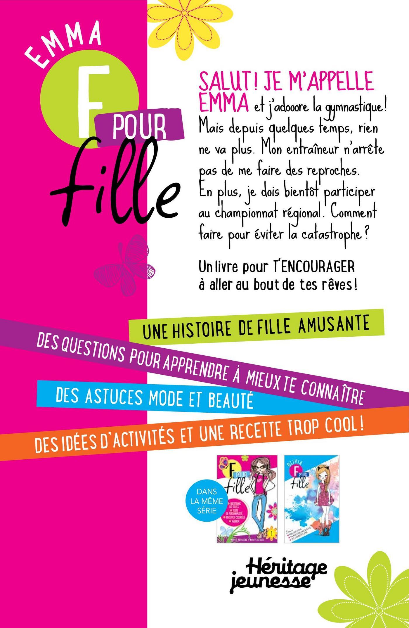 Je m’appelle Emma et j’adoooore la gymnastique! J’en fais depuis que je suis toute petite et j’ai toujours été très douée. Mon entraîneur m’a même dit que cette année, si je travaillais très fort, je pourrais peut-être participer aux jeux du Québec! Enfin... ça c’était avant... parce que là, je ne sais même plus si je fais toujours partie de l’équipe. Hier, l’entraînement a été une véritable catastrophe... Je suis totalement désespérée. Oh, non... est-ce que c’est déjà la fin de ma carrière de gymnaste?F pour fille : DES ROMANS parfaits pour toi et tes amies!- Une histoire de fille amusante;- Des questionnaires pour apprendre à te connaître à remplir avec tes amies; - Des astuces mode et beauté;- Des idées d’activités et des recettes trop cool!