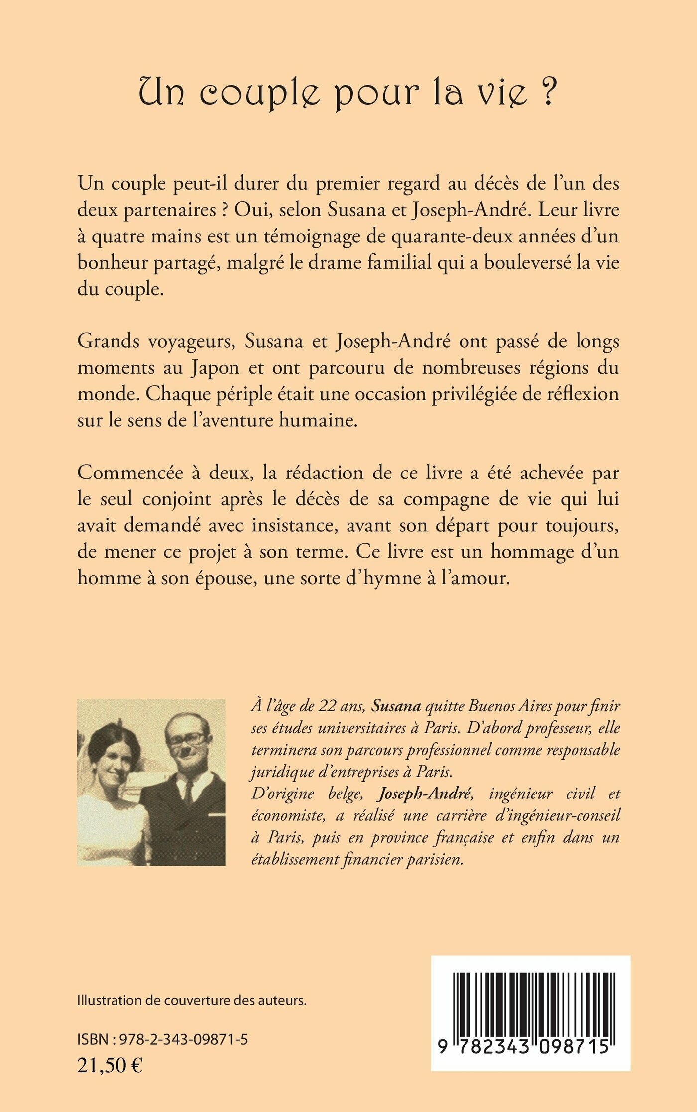 Un couple peut-il durer du premier regard au décès de l'un des deux partenaires ? Oui, selon Susana et Joseph-André. Leur livre écrit à quatre mains est un témoignage de quarante-deux années d'un bonheur partagé, malgré le drame familial qui a bouleversé la vie du couple. Grands voyageurs, Susana et Joseph-André ont passé de longs moments au Japon, et ont parcouru de nombreuses régions du monde. Chaque périple était alors une occasion privilégiée de réflexion sur le sens de l'aventure humaine. Commencée à deux, la rédaction de ce livre a été achevée par Joseph-André suite au décès de son épouse. Ce livre est un hommage, une sorte d'hymne à l'amour.