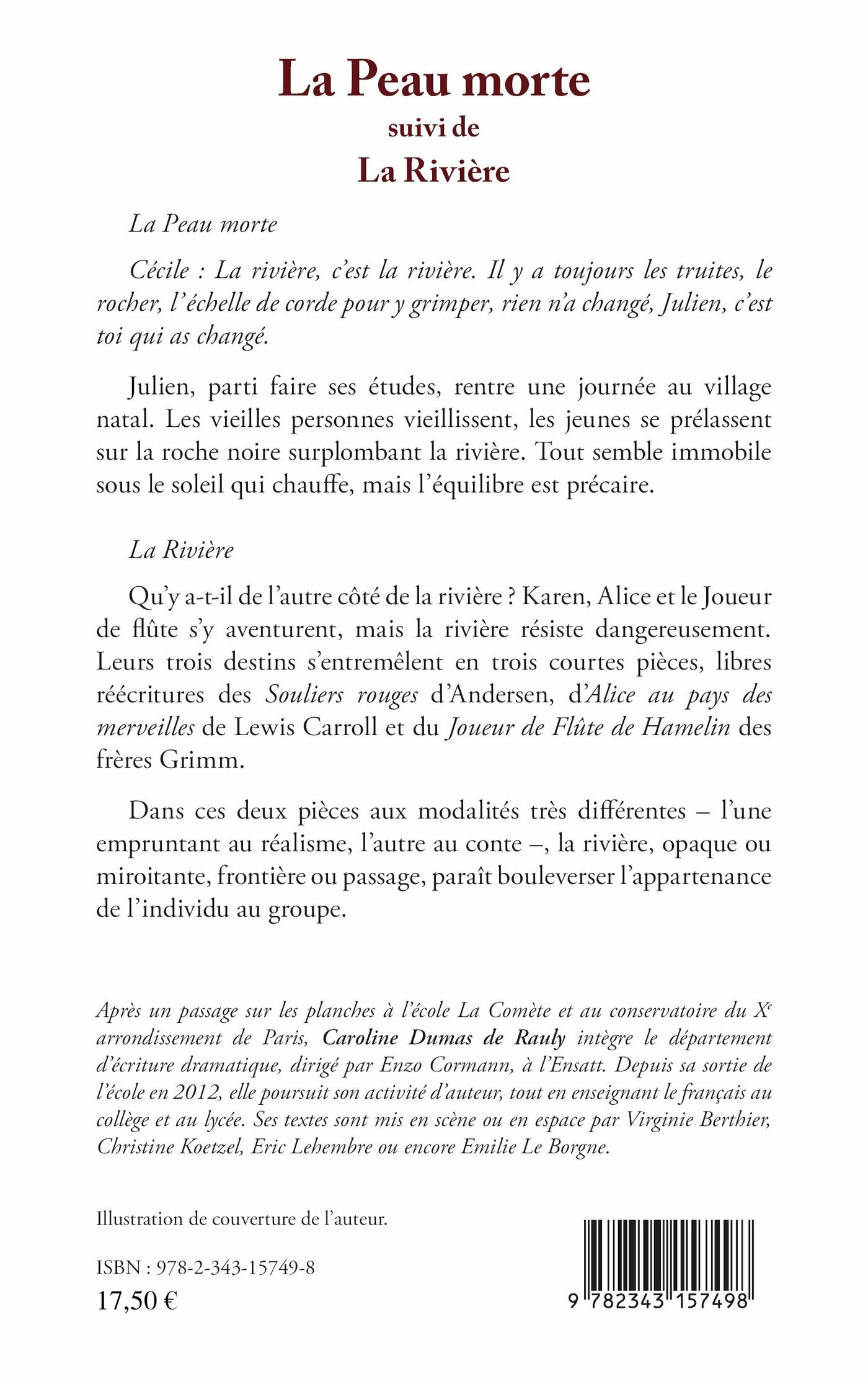 Peau morte.Julien, parti faire ses études, rentre une journée au village natal. Les vieilles personnes vieillissent. Les jeunes se prélassent sur la roche noire surplombant la rivière. Tout semble immobile sous le soleil qui chauffe, mais l'équilibre est précaire : "rien n'a changé, Julien, c'est toi qui a changé".La RivièreQu'y a-t-il de l'autre côté de la rivière ? Karen, Alice et le Joueur de flûte s'y aventurent, mais la rivière résiste dangereusement. Leurs trois destins s'entremêlent en trois courtes pièces, libres réécritures des Souliers rouges d'Andersen, d'Alice au pays des merveilles de Lewis Carroll et du Joueur de Flûte de Hamelin des frères Grimm.