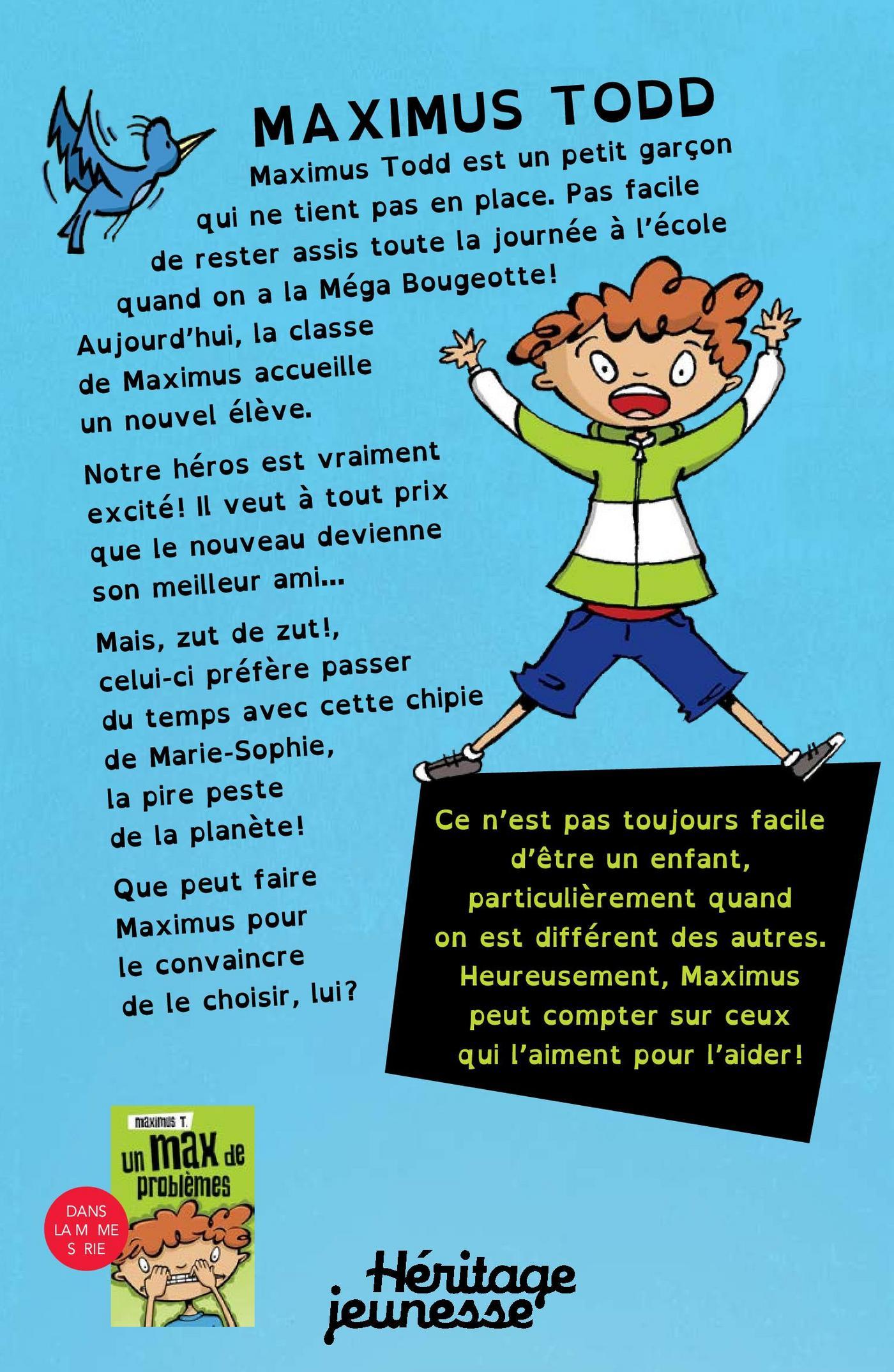 Maximus est un petit garçon qui ne tient pas en place. À l’école, il a beaucoup de mal à ne pas se tortiller sur sa chaise du matin au soir. Pour y parvenir, il a mis au point un jeu secret : relever des défis compliqués qui maintiennent son attention en éveil et qui l’aident à rester concentré. Aujourd’hui, la classe de Maximus accueille un nouvel élève. Notre héros est vraiment excité et bien décidé à en faire son nouveau meilleur ami! Mais, zut de zut!, le petit nouveau semble préférer la compagnie de cette peste de Marie-Sophie Soucy!Une série qui parle d’un enfant différent, aux prises avec plusieurs troubles et difficultés et qui doit relever de nombreux défis au quotidien et particulièrement à l’école. Grâce à son intelligence et à sa créativité, ainsi qu’à l’appui de ses amis et d’adultes bienveillants, il parvient à s’adapter à son environnement et même à connaître le succès à l’école. Un exemple positif pour les enfants qui se sentent parfois seuls avec leurs différences…