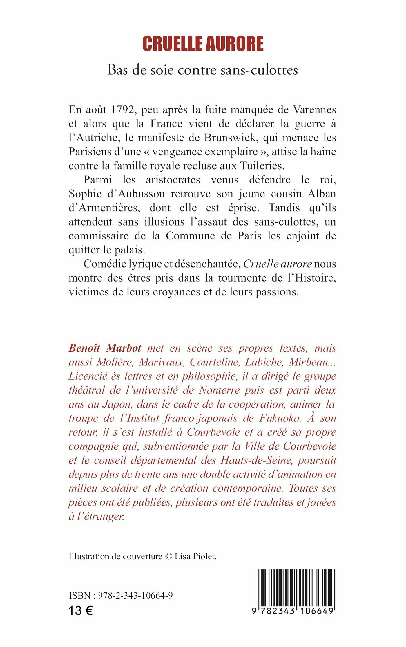 En août 1792, peu après la fuite manquée de Varennes et alors que la France vient de déclarer la guerre à l'Autriche, le manifeste de Brunswick, qui menace les Parisiens d'une "vengeance exemplaire" attise la haine contre la famille royale recluse aux Tuileries. Parmi les aristocrates venus défendre le roi, Sophie d'Aubusson retrouve son jeune cousin Alban d'Armentières, dont elle est éprise. Tandis qu'ils attendent sans illusions l'assaut des sans-culottes, un commissaire de la Commune de Paris les enjoint de quitter le Palais. Comédie lyrique et désenchantée, Cruelle aurore nous montre des êtres pris dans la tourmente de l'Histoire, victimes de leurs croyances et de leurs passions.