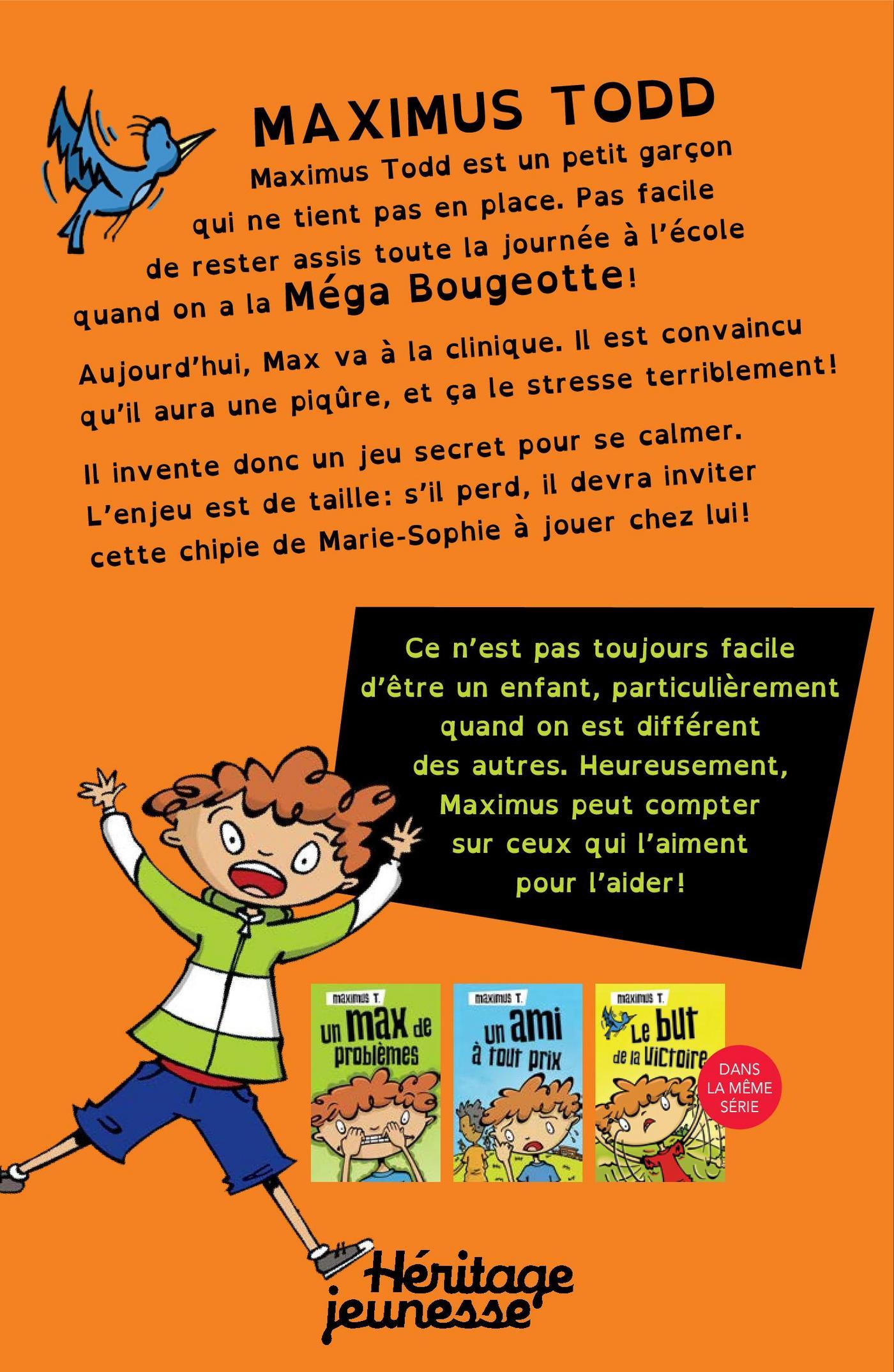 Maximus doit aller chez le médecin pour se faire vacciner quand horreur!!! il est victime d’une attaque de méga-bougeotte sévère. Vite, notre héros doit inventer un jeu secret pour se tirer de ce mauvais pas! Car si il échoue... il devra inviter Marie-Sophie Soucy - la pire des pestes de l’école! - à venir jouer chez lui...À propos de la sérieMaximus est un enfant différent, aux prises avec plusieurs troubles et difficultés. Il doit relever de nombreux défis au quotidien et particulièrement à l’école. Grâce à son intelligence et à sa créativité, ainsi qu’à l’appui de ses amis et d’adultes bienveillants, il parvient à s’adapter à son environnement et même à connaître le succès à l’école. Un exemple positif pour les enfants qui se sentent parfois seuls avec leurs différences…