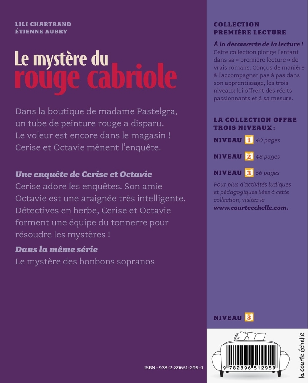 Pour rendre service à son père, Cerise se rend au magasin de madame Pastelgra pour acheter un tube de rouge cabriole. Cette peinture a le pouvoir spécial de rendre les objets vivants. Or, le tube a disparu! Si le rouge cabriole tombe entre de mauvaises mains, le résultat pourrait être catastrophique. Heureusement, madame Pastelgra sait que le suspect se trouve encore dans le magasin. Cerise et Octavie mènent l’enquête.