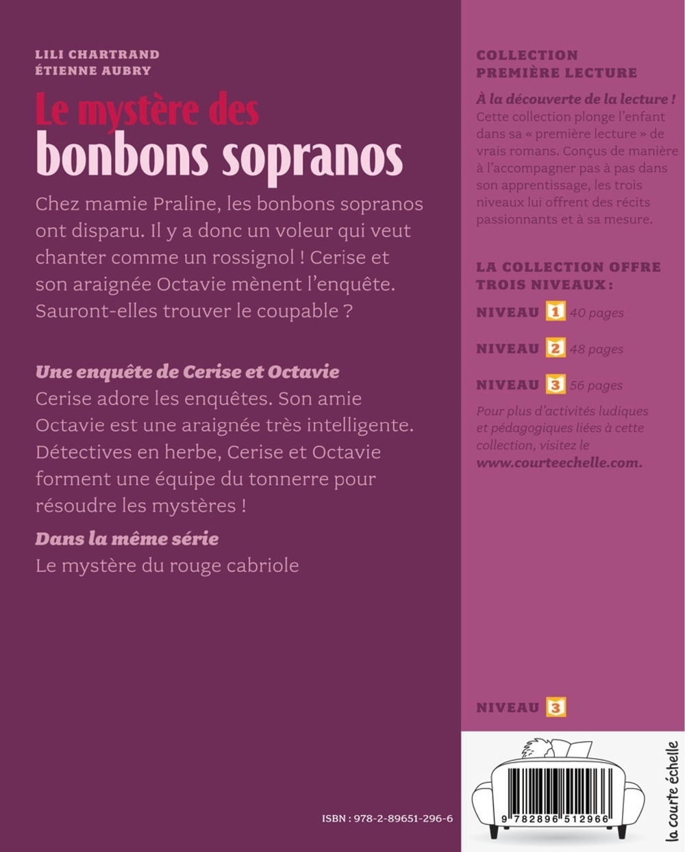 Cerise se rend chez sa grand-maman pour mener une enquête, car les bonbons sopranos ont disparu. Ces bonbons bien particuliers permettent de chanter comme un rossignol. Selon mamie, le coupable se trouve parmi ses amis qui viennent chez elle jouer aux cartes. Cerise et son araignée Octavie sauront-elles identifier le voleur?