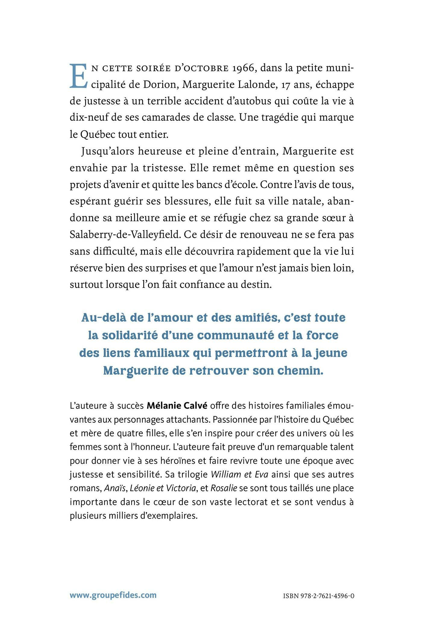 Une histoire de résilience face à la tragédie vécue par toute une communautéEn cette soirée d’octobre 1966, dans la petite municipalité de Dorion, Marguerite Lalonde, 17 ans, échappe de justesse à un terrible accident d’autobus qui coûte la vie à 19 de ses camarades de classe. Une tragédie qui marque le Québec tout entier.Jusqu’alors heureuse et pleine d’entrain, Marguerite est envahie par la tristesse. Elle remet même en question ses projets d’avenir et quitte les bancs d’école. Contre l’avis de tous, espérant guérir ses blessures, elle fuit sa ville natale, abandonne sa meilleure amie et se réfugie chez sa grande sœur à Valleyfield. Ce désir de renouveau ne se fera pas sans difficulté, mais elle découvrira rapidement que la vie lui réserve bien des surprises et que l’amour n’est jamais bien loin, surtout lorsque l’on fait confiance au destin.Au-delà de l’amour et des amitiés, c’est toute la solidarité d’une communauté et la force des liens familiaux qui permettront à la jeune Marguerite de retrouver son chemin.