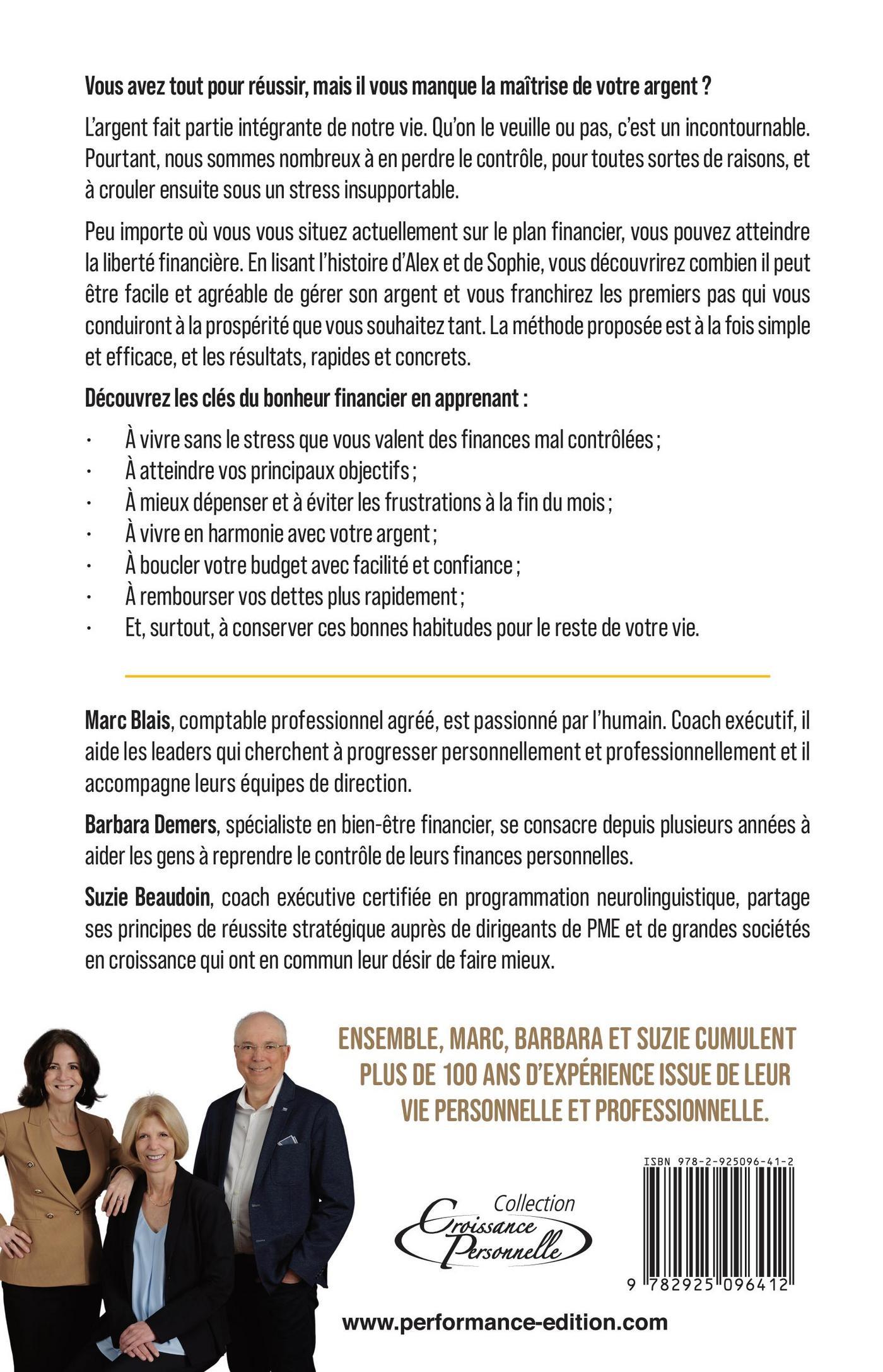 Vous avez tout pour réussir, mais il vous manque la maîtrise de votre argent ?L’argent fait partie intégrante de notre vie. Qu’on le veuille ou pas, c’est un incontournable. Pourtant, nous sommes nombreux à en perdre le contrôle, pour toutes sortes de raisons, et à crouler ensuite sous un stress insupportable.Peu importe où vous vous situez actuellement sur le plan financier, vous pouvez atteindre la liberté financière. En lisant l’histoire d’Alex et de Sophie, vous découvrirez combien il peut être facile et agréable de gérer son argent et vous franchirez les premiers pas qui vous conduiront à la prospérité que vous souhaitez tant. La méthode proposée est à la fois simple et efficace, et les résultats, rapides et concrets.Découvrez les clés du bonheur financier en apprenant :- À vivre sans le stress que vous valent des finances mal contrôlées;- À atteindre vos principaux objectifs;- À mieux dépenser et à éviter les frustrations à la fin du mois;- À vivre en harmonie avec votre argent;- À boucler votre budget avec facilité et confiance;- À rembourser vos dettes plus rapidement;- Et, surtout, à conserver ces bonnes habitudes pour le reste de votre vie.