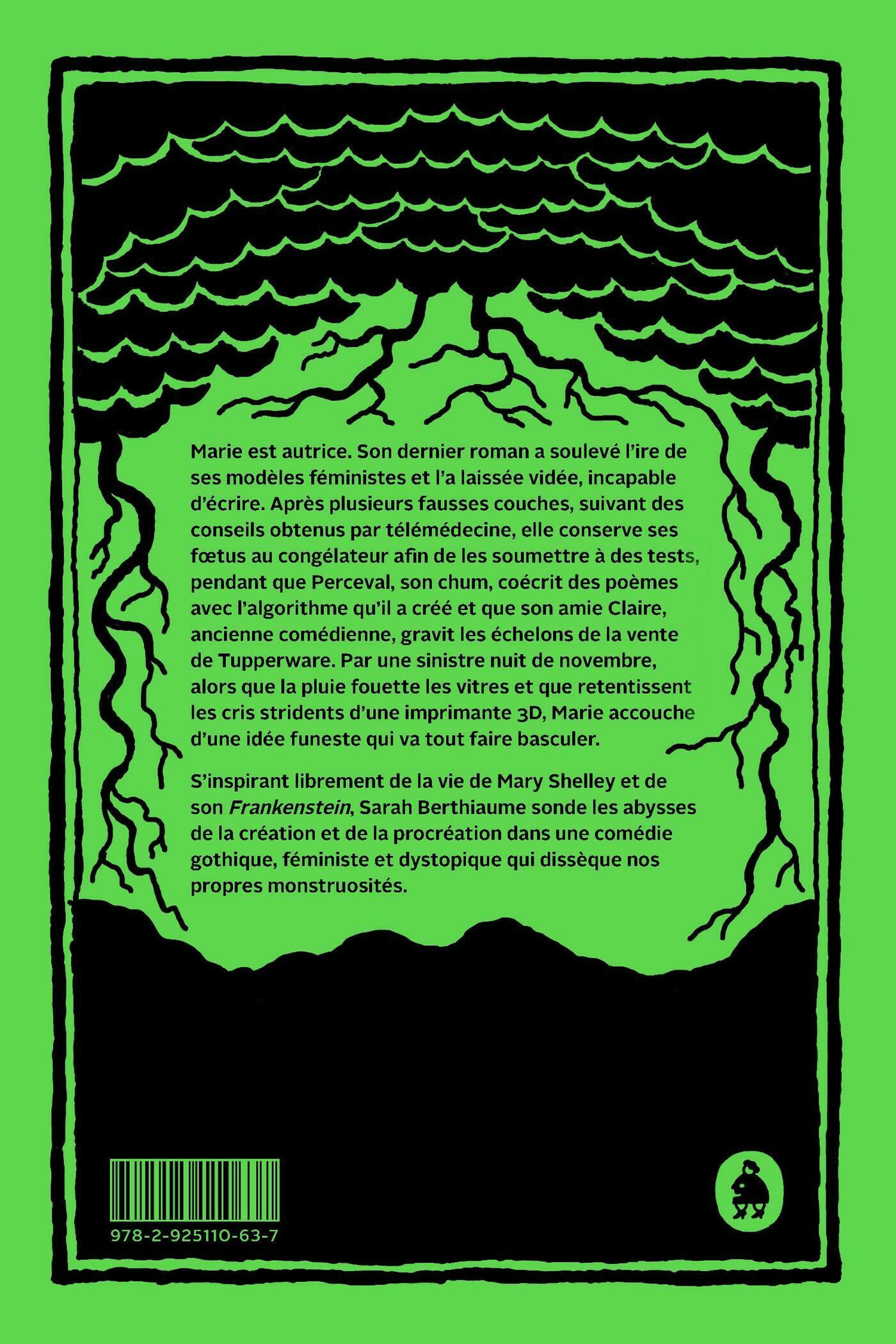 Marie est autrice. Son dernier roman a soulevé l’ire de ses modèles féministes et l’a laissée vidée, incapable d’écrire. Après plusieurs fausses couches, suivant des conseils obtenus par télémédecine, elle conserve ses fœtus au congélateur afin de les soumettre à des tests, pendant que Perceval, son chum, coécrit des poèmes avec l’algorithme qu’il a créé et que son amie Claire, ancienne comédienne, gravit les échelons de la vente de Tupperware. Par une sinistre nuit de novembre, alors que la pluie fouette les vitres et que retentissent les cris stridents d’une imprimante 3D, Marie accouche d’une idée funeste qui va tout faire basculer.